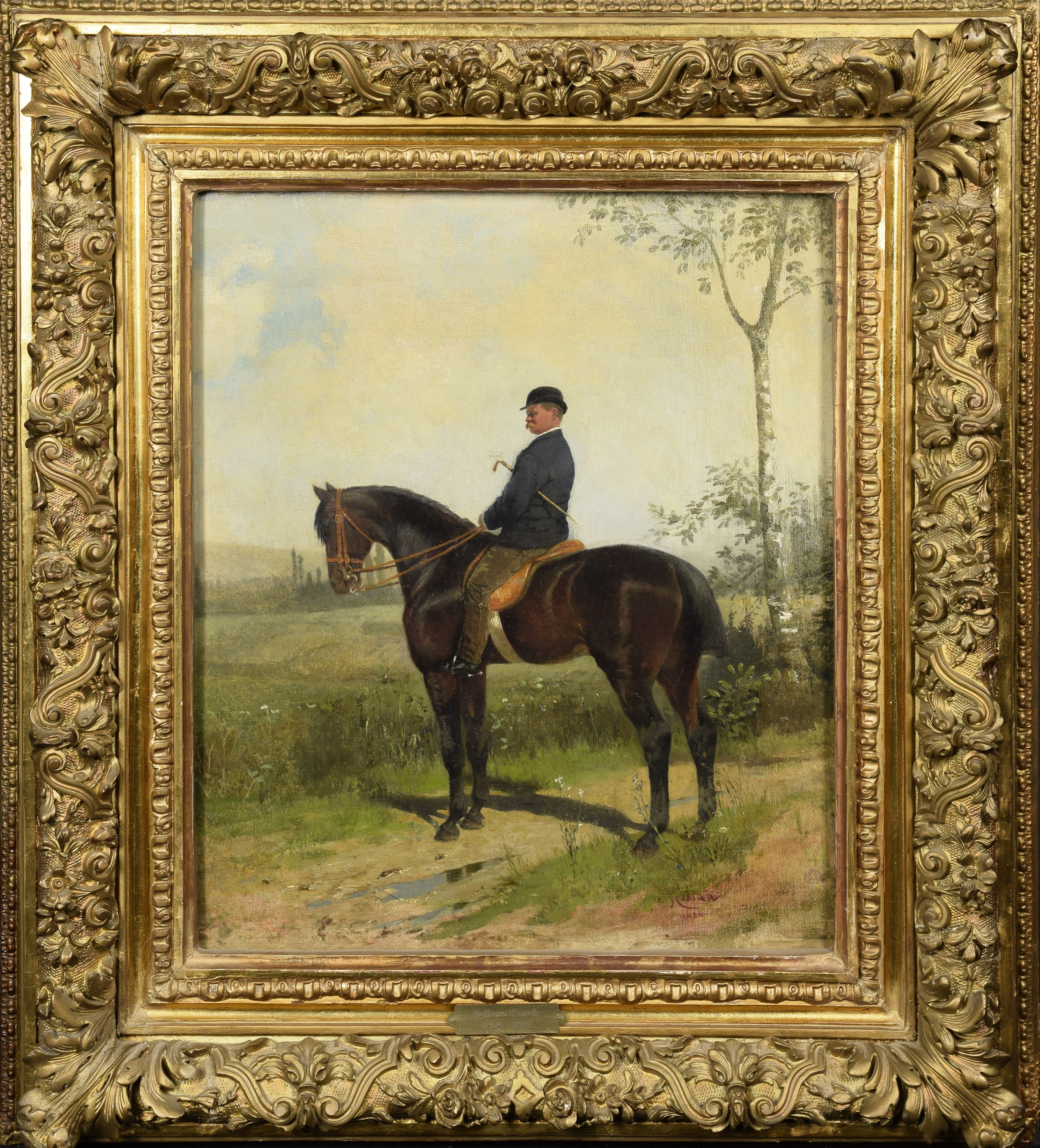 W centralnej partii kompozycji, na zwróconym w lewo karogniadym koniu, siedzi mężczyzna w ciemnoniebieskim kubraku z białą wypustką koszuli przy szyi i mankiecie oraz długich brązowych spodniach ozdobionych wzdłuż szwu, od kolana w dół, guzikami. Na głowie ma czarny melonik, spod którego widać krótko ostrzyżone rudawo-blond włosy. Koń i siedzący nań jeździec stoją na wąskiej, piaszczystej dróżce, w tle lekko sfalowany pejzaż z polami i łąkami oraz kilkoma wysokimi topolami na horyzoncie. Kompozycja utrzymana jest w charakterystycznym dla Juliusza Kossaka tonie – łączy realistyczne ujęcie postaci z subtelnym, lirycznym nastrojem krajobrazu. Artysta z dużą precyzją oddał anatomię konia i elegancką sylwetkę jeźdźca, co świadczy o jego doskonałym warsztacie i głębokiej znajomości tematu hippicznego. Na początku swojej artystycznej drogi Juliusz miał wielu mecenasów, a przebywając w ich dworach obserwował życie arystokracji, malował sceny z polowań, portrety, konie, stadniny. Jego pierwszym mistrzem i doradcą był malarz koni – akwarelista Piotr Michałowski. Po kilkuletnim okresie pobytu w Paryżu, Kossak rozwijał swój indywidualny styl. Tworzył liczne sceny rodzajowe i portrety jeźdźców, które stanowiły preludium do późniejszych, szerzej znanych kompozycji historycznych i batalistycznych. „Portret mężczyzny na koniu” reprezentuje wczesny etap tej drogi twórczej - łączy dokumentalny charakter przedstawienia z romantycznym duchem polskiego pejzażu, wpisując się w krąg prac portretujących przedstawicieli ziemiaństwa i oficerów, w których artysta podkreślał tradycję polskiej kultury konnej. Juliusz Kossak był mistrzem akwareli, w której osiągnął wyjątkową lekkość i świeżość barw. Często jednak sięgał także po technikę olejną, zwłaszcza w portretach i większych kompozycjach. Jego styl charakteryzuje się precyzyjnym rysunkiem, dbałością o detal, doskonałą znajomością anatomii konia i umiejętnością oddania ruchu. Łączył realistyczne obserwacje z romantycznym nastrojem i głębokim poczuciem polskiego pejzażu.