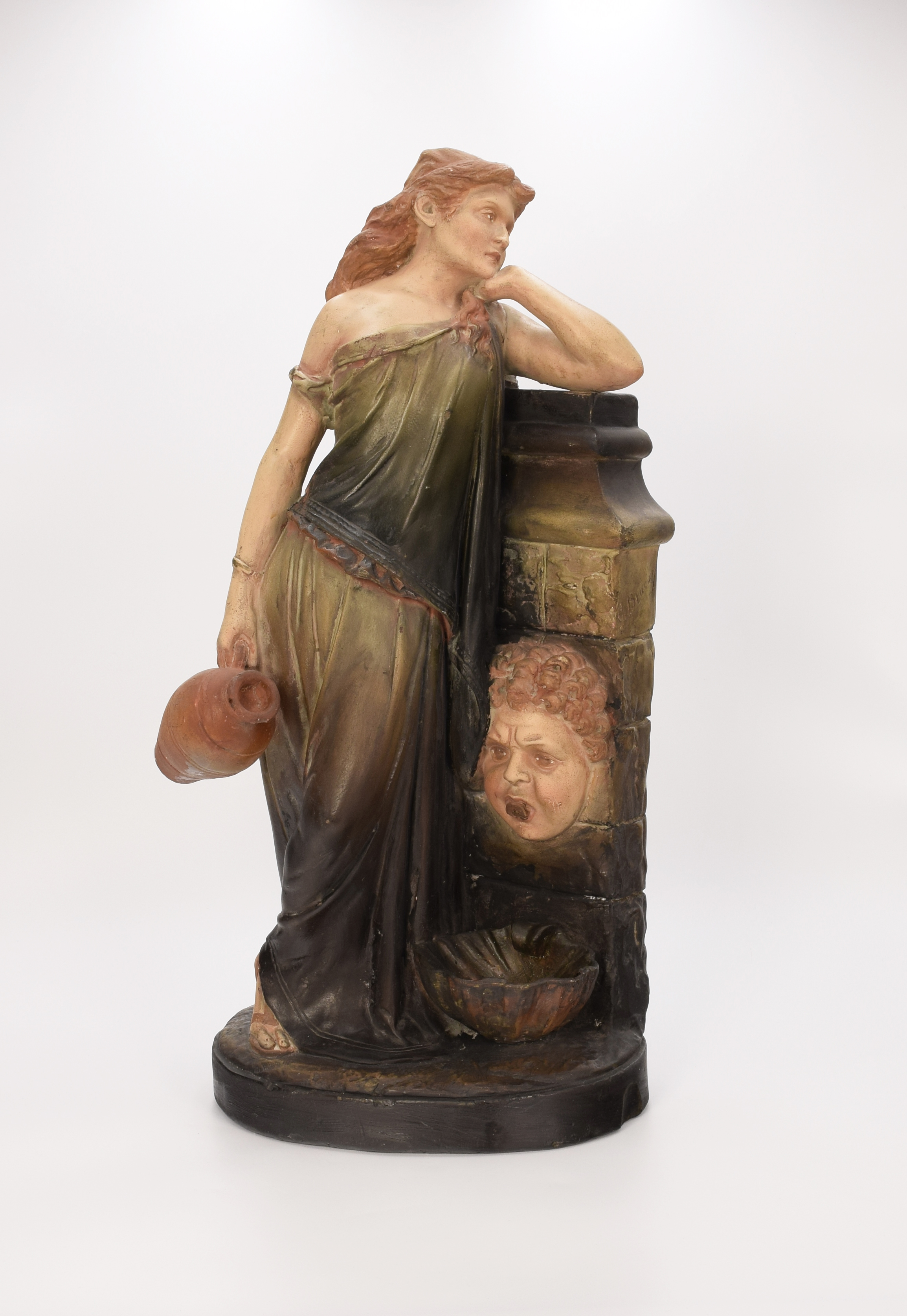 gips, polichromia barwna imitująca szkliwa ceramiczne, wyszczerbienie ujęcia wody (kranik w ustach putta), drobne wyszczerbienia, ubytki i przetarcia warstwy malarskiej; wys. 59 cm, podstawa 27 x 19,5 cm; sygn. ryta z boku: G. Bracony, z tyłu przy podstawie ryte: Nardi Editeur, wyżej: 43. Francja, Nardi Editeur (producent odlewów gipsowych), XIX/XX w.; wg rzeźby Gugliemo Bracony (1838-1921). Na owalnej podstawie kobieta w powłóczystej antykizującej szacie, stojąca w kontrapoście przy kamiennym zdroju z ujęciem wody w formie plastycznej maski putta, z muszlową misą niżej. Oparta lewym ramieniem o murek, z brodą wspartą na dłoni; w prawej opuszczonej ręce trzyma dzban. Kompozycja wg marmurowej rzeźby „Wasserträgerin” (Kobieta niosąca dzban wody) czynnego we Włoszech rzeźbiarza Gugliemo Bracony’ego; realizacja w gipsie polichromowanym barwnie francuskiego producenta Nardi (Editeur Nardi), wykonującego kopie rzeźb - gipsowe odlewy imitujące metal lub ceramikę.