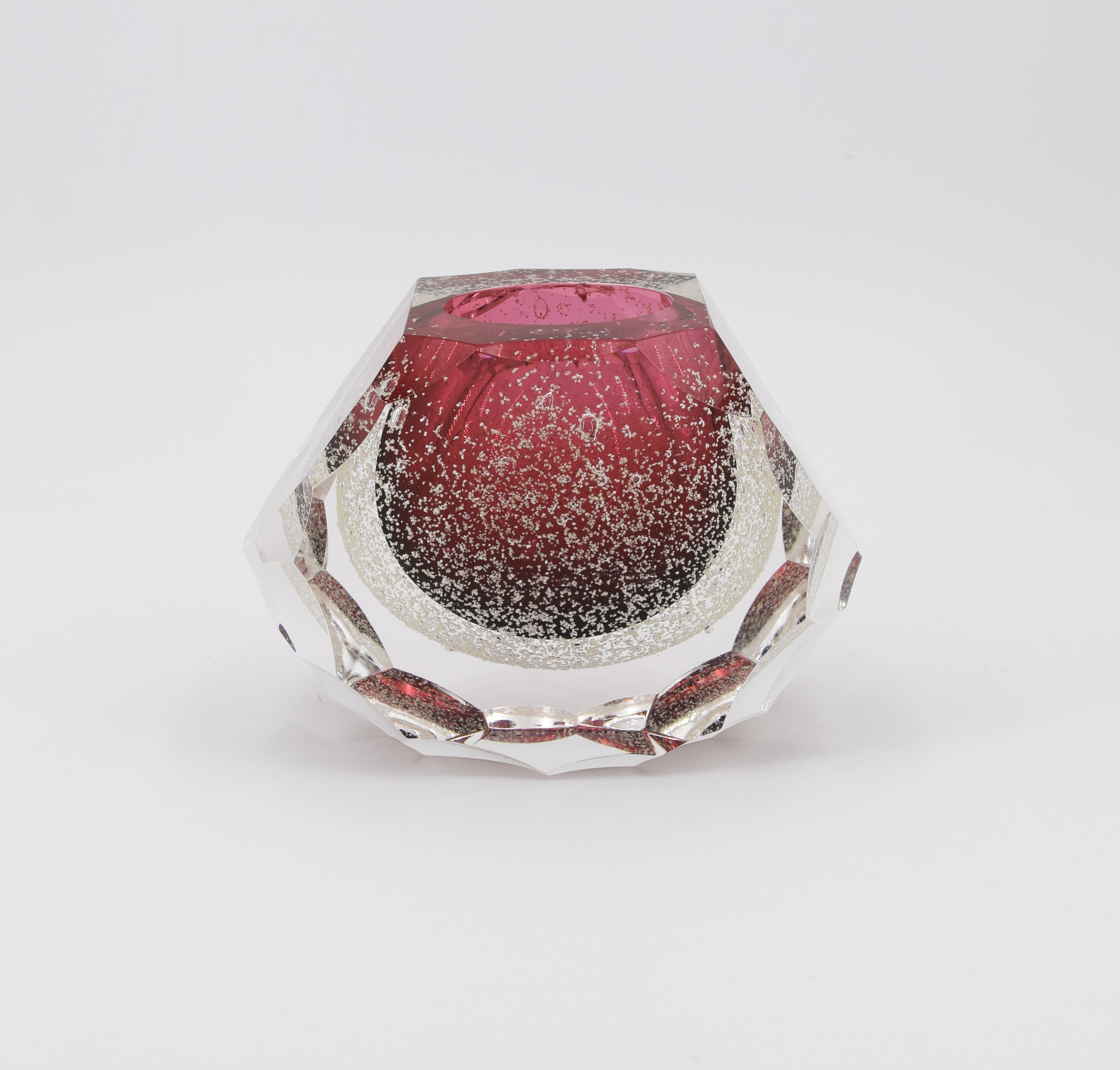 szkło przeźroczyste, częściowo barwione w kolorze rubinowym, zdobione uranem, szlifowane; wymiary: 12,5 x 15 x 10 cm;