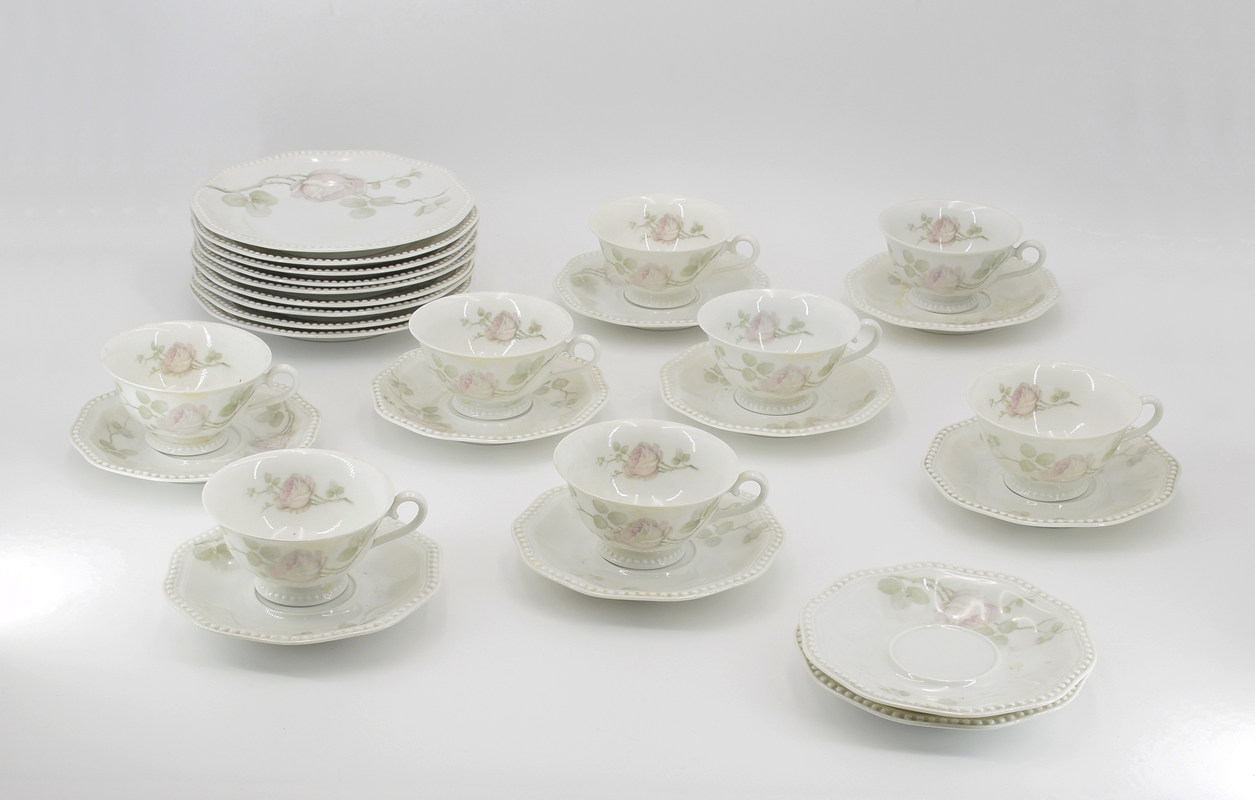 porcelana malowana podszkliwnie; filiżanka 7 szt. wym.: 6 x 10 x 12 cm, spodeczek 9 szt. śr.:15,5 cm , talerzyk 9 szt. śr.: 20 cm;