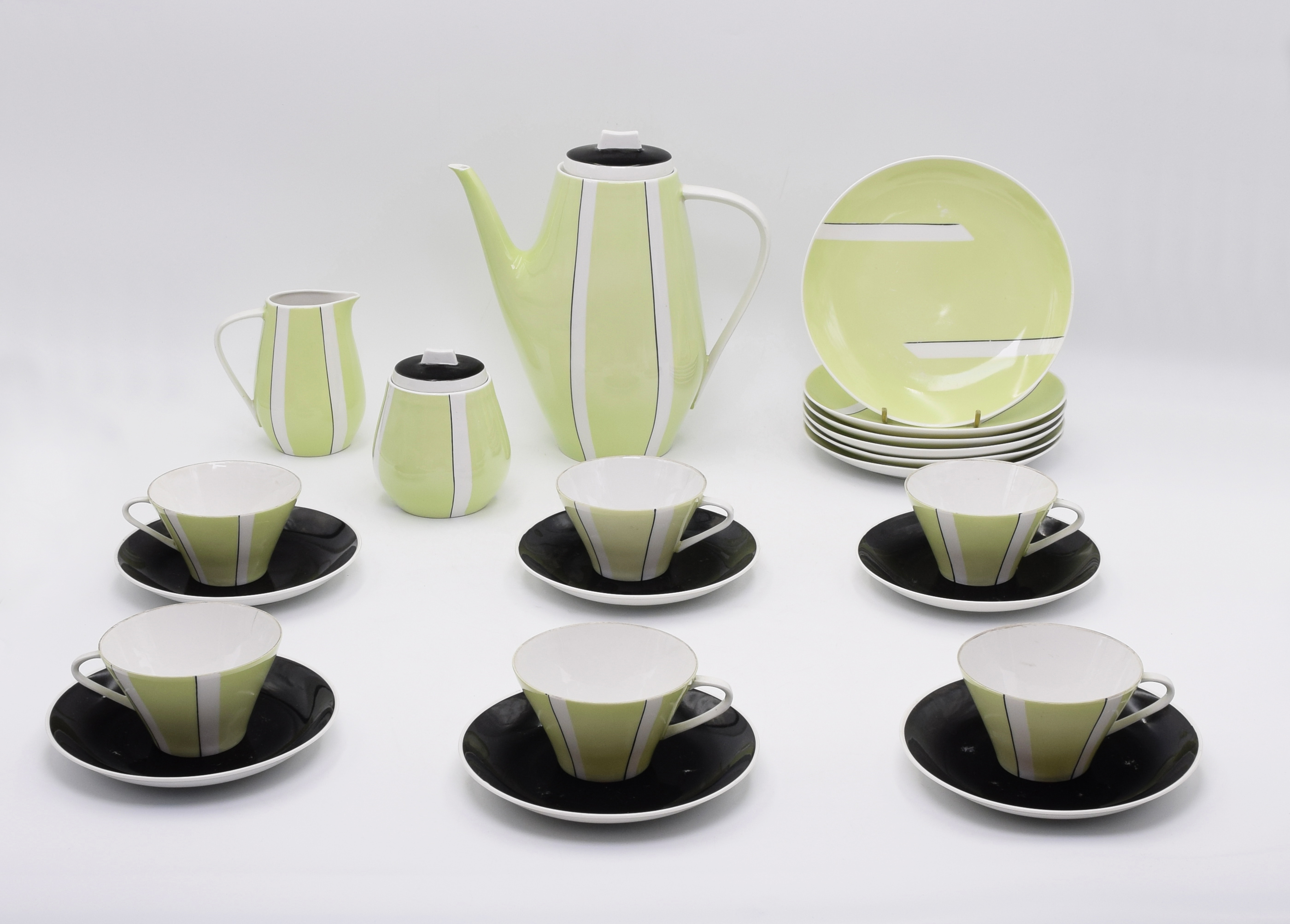 porcelana malowana podszkliwnie; wymiary: dzbanek 25 x 22 x 12 cm, cukiernica 11,5 x 9,5 x 9,5 cm, mlecznik 11,5 x 11 x 7 cm, filiżanka 5,6 x 11,5 x 9,5 cm, spo