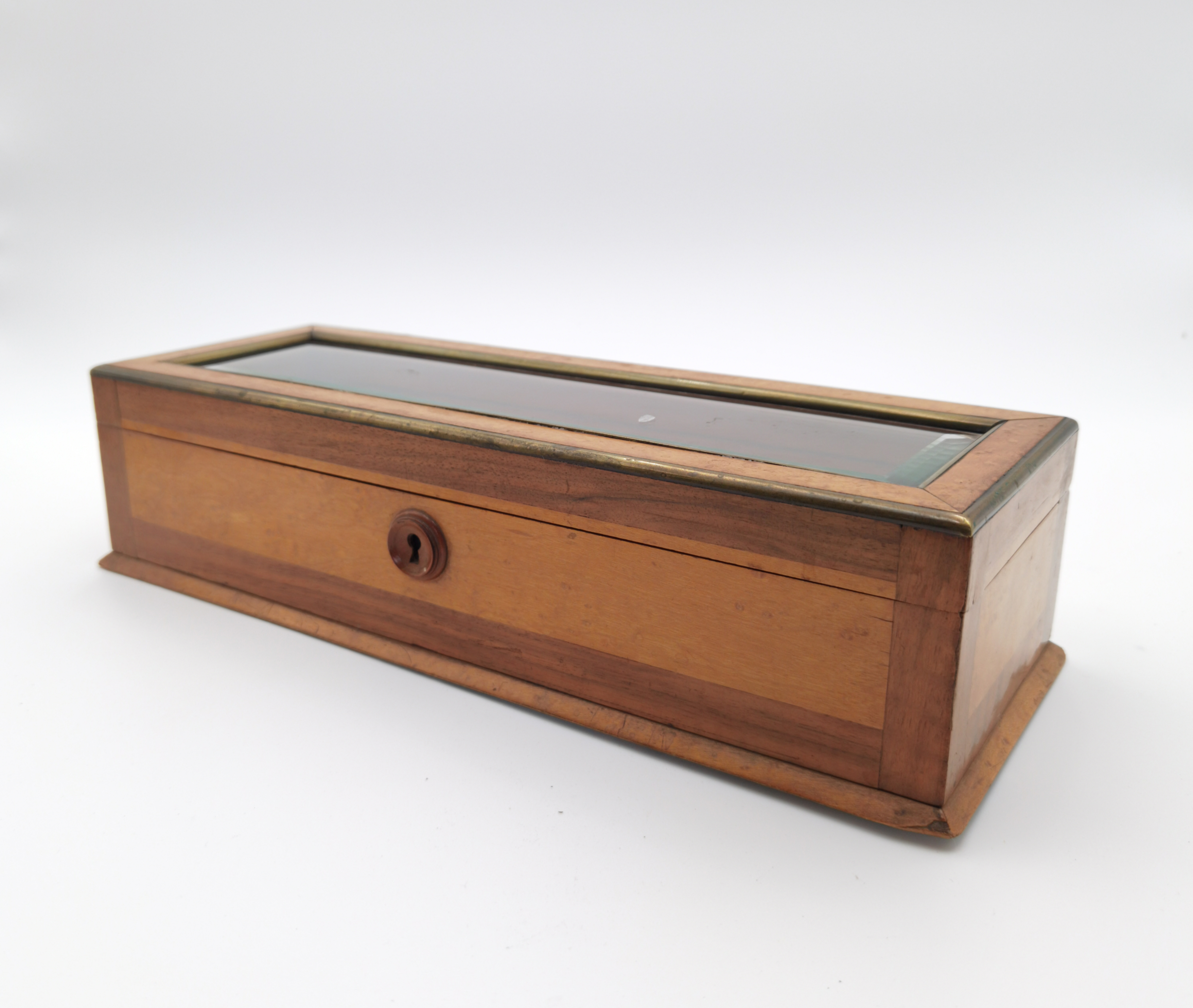 drewno, szkło fazowane, mosiądz, tkanina (mora); 9 x 35 x 12 cm.