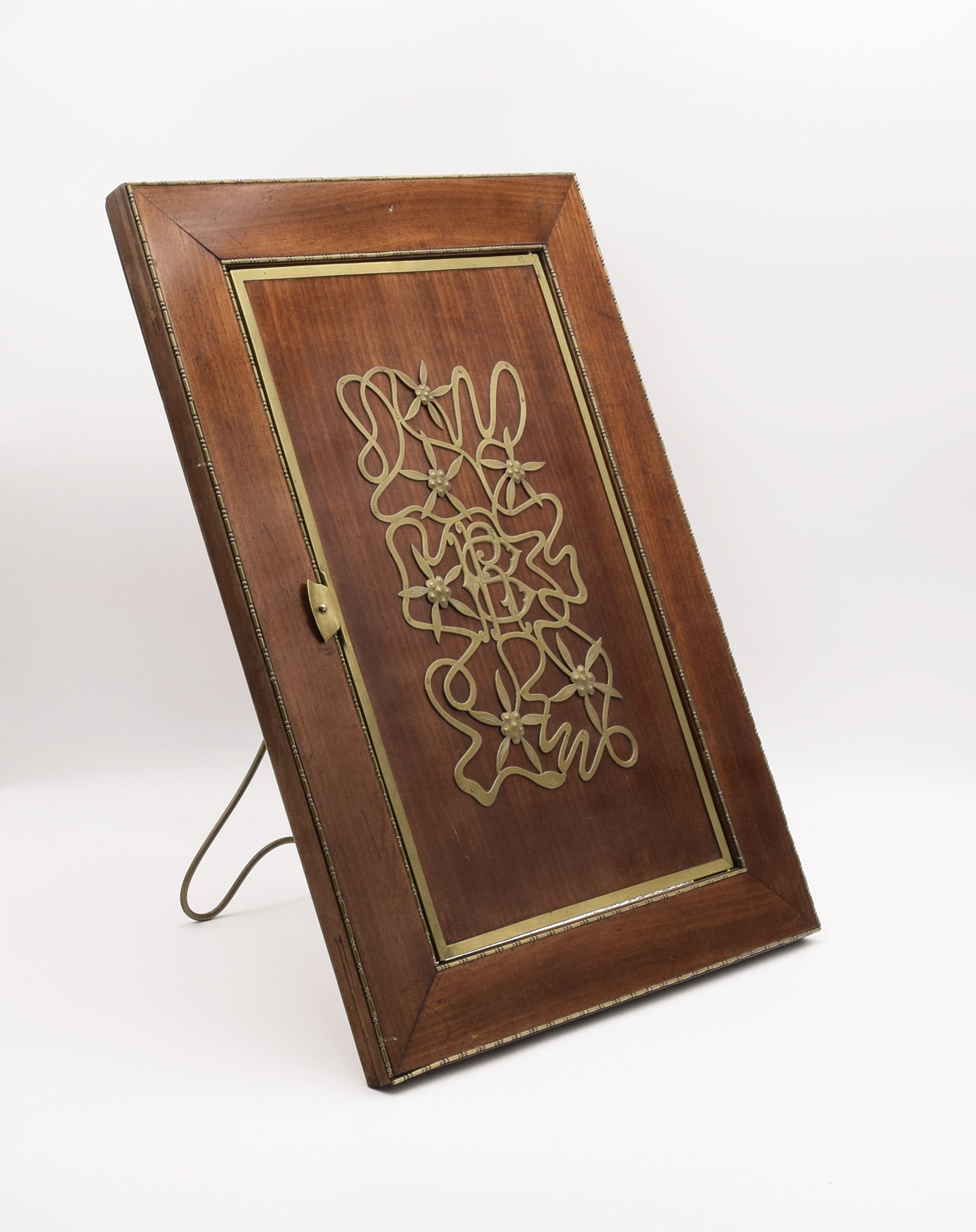 mahoń, aplikacje mosiężne, tafla lustrzana; wym. w rozłożeniu: 49,5 x 55 x 50 cm.