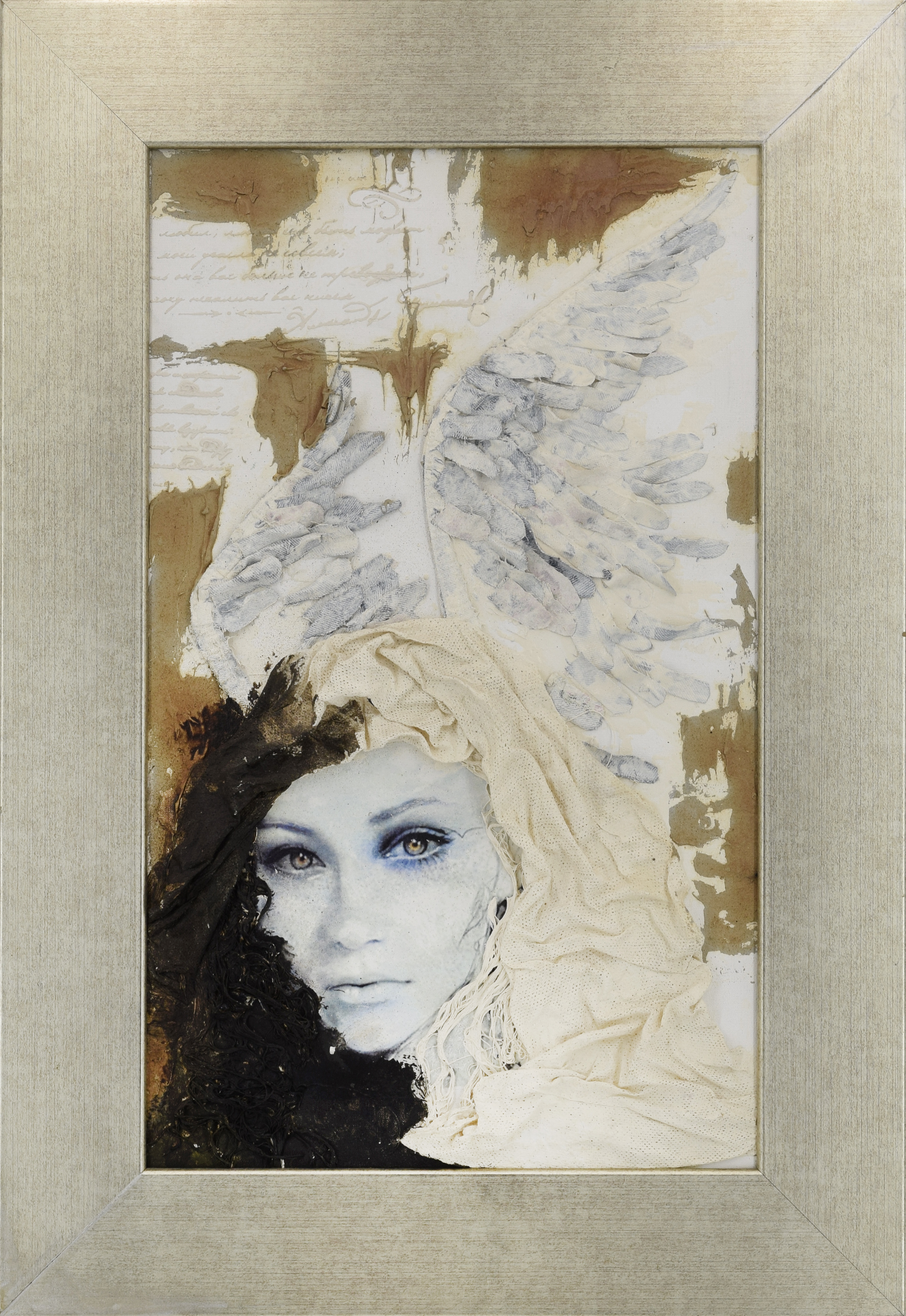 kolaż, olej, technika własna, płótno; 49 x 29 cm (w świetle oprawy).