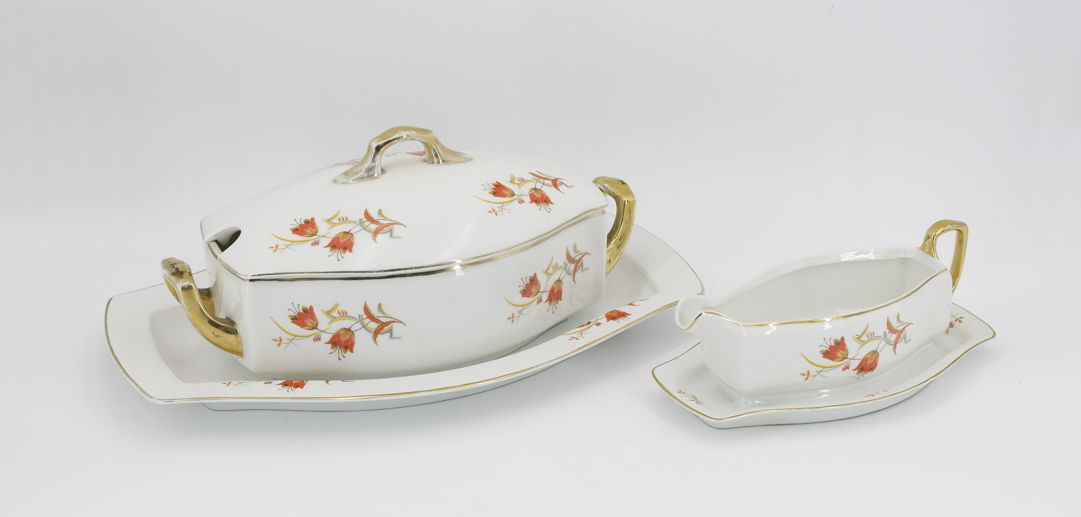 porcelana, nadruk, złocenia; wymiary: waza; 15,5 x 20 x 37 cm, patera; 43 x 28 cm, sosjerka 10,5 x 14 x 24,5;