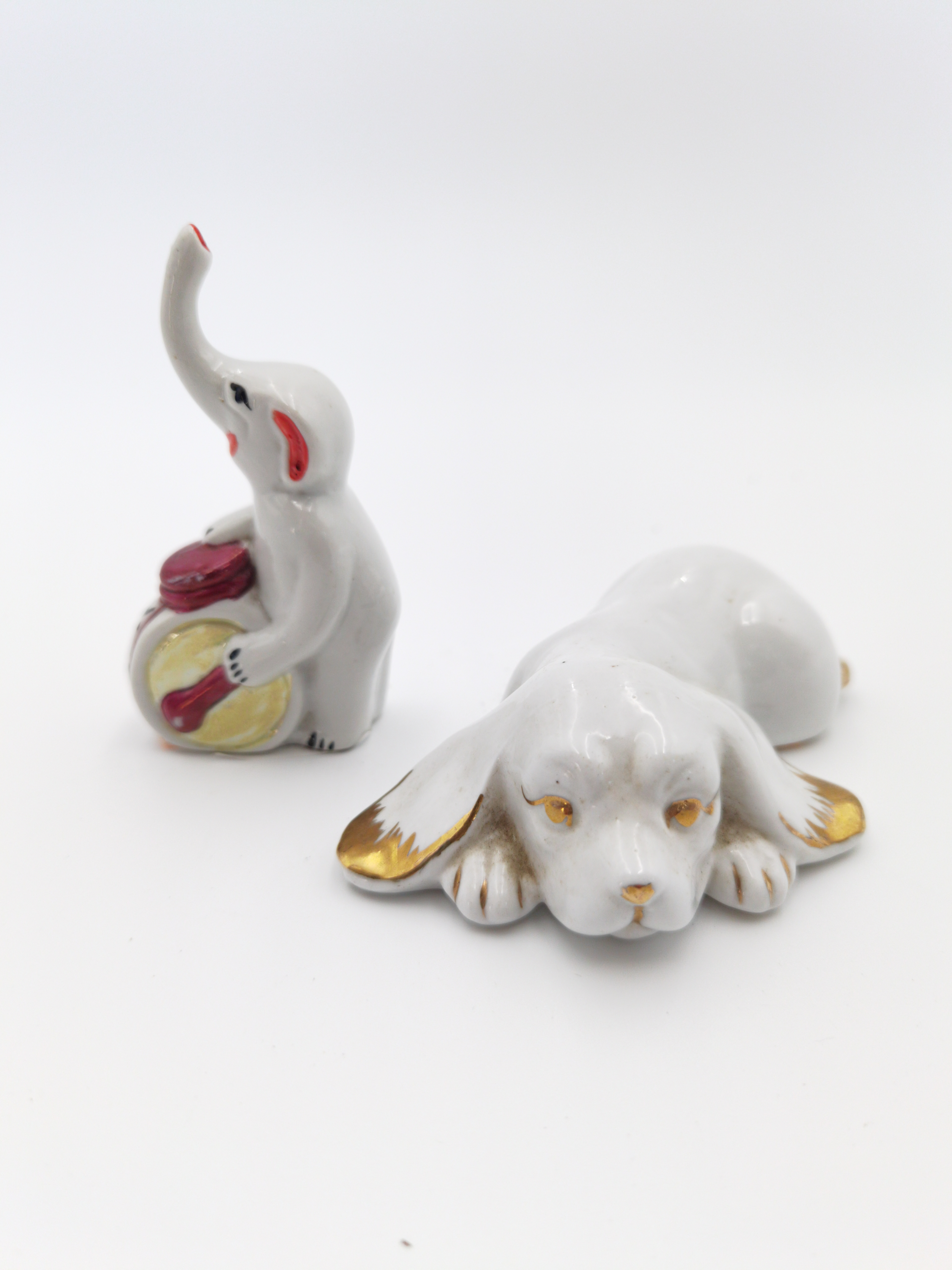 porcelana malowana, złocona; słonik wys.: 10 cm, piesek wym.: 3,3 x 11 x 10,5 cm;