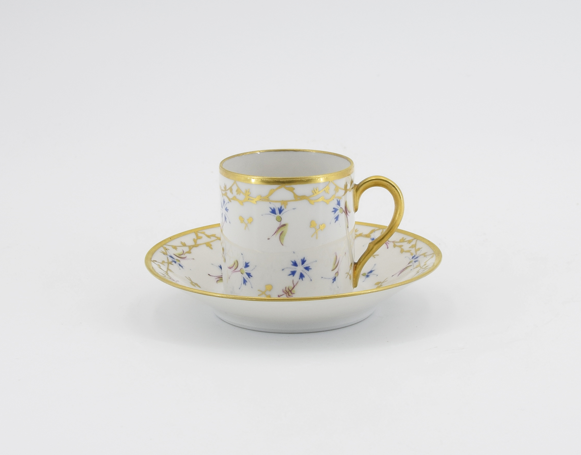porcelana malowana, złocona; filiżanka wym.: 5,5 x 6,5 x 5 cm, spodeczek śr.: 11,5 cm;
