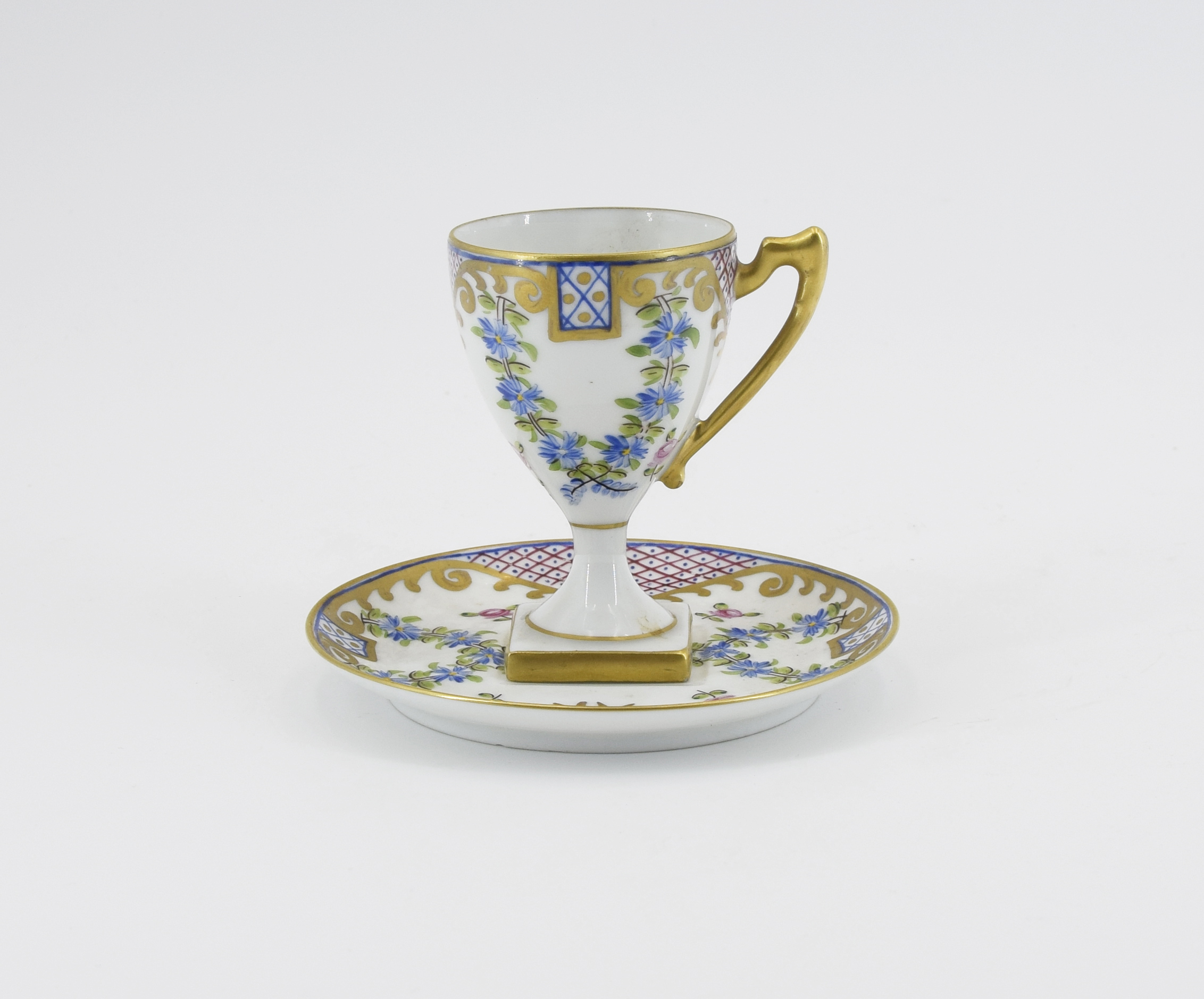 porcelana malowana, złocenie; filiżanka wym.: 8 x 7 x 5,2 cm, spodeczek średn.: 11,2 cm;