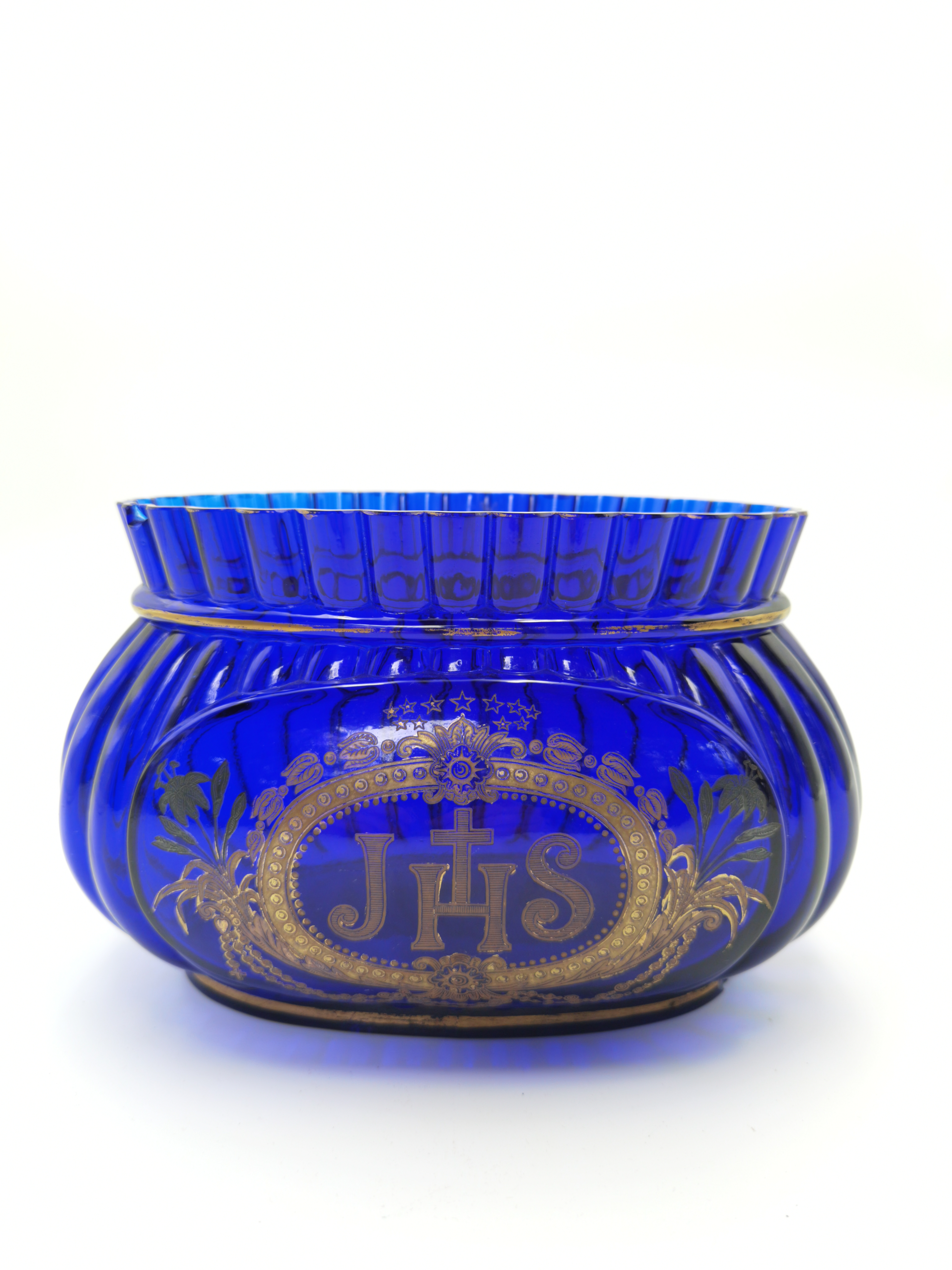 szkło kobaltowe, rytowanie mechaniczne, złocenie; 15 x 25 x 17 cm.