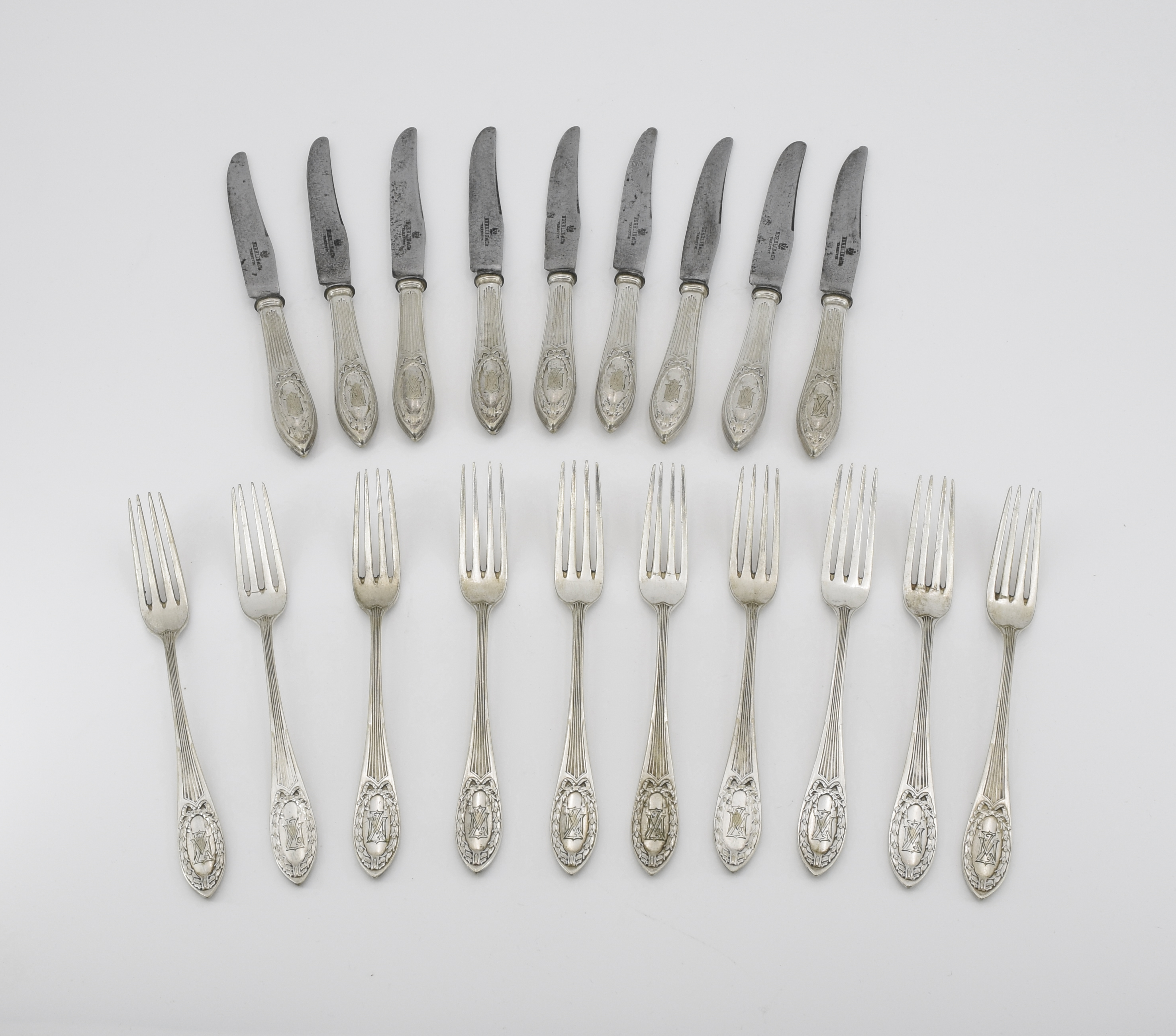 plater, trzonki wypełniane, ostrza: stal z ozn.: orzeł / NORBLIN / et cie / VARSOVIE; noże dł.: 21 cm, widelce dł.: 18 cm.