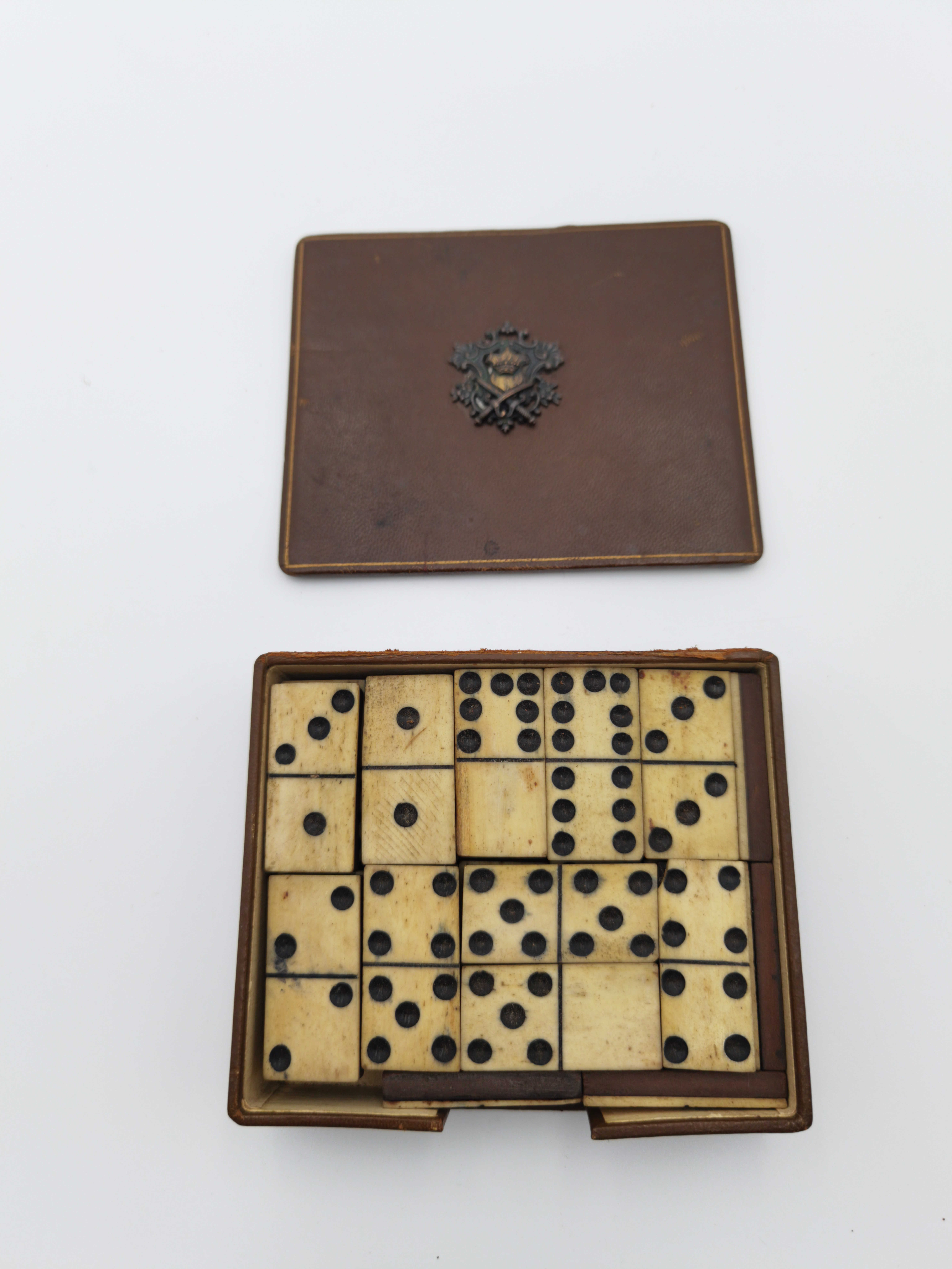 drewno, kość zwierzęca, etui skórzane; wym. całkowity: 4 x 13,5 x 11,5 cm.