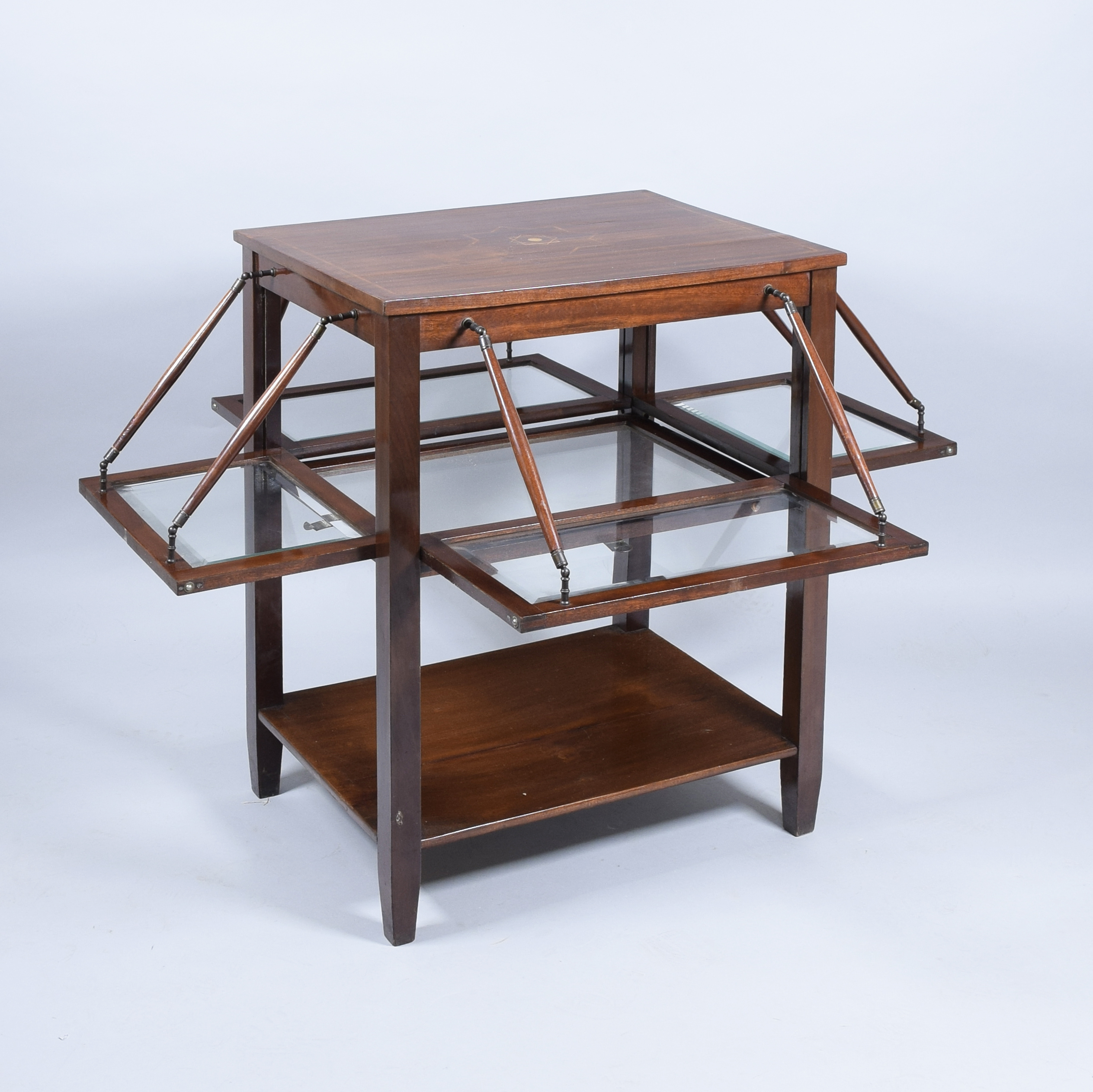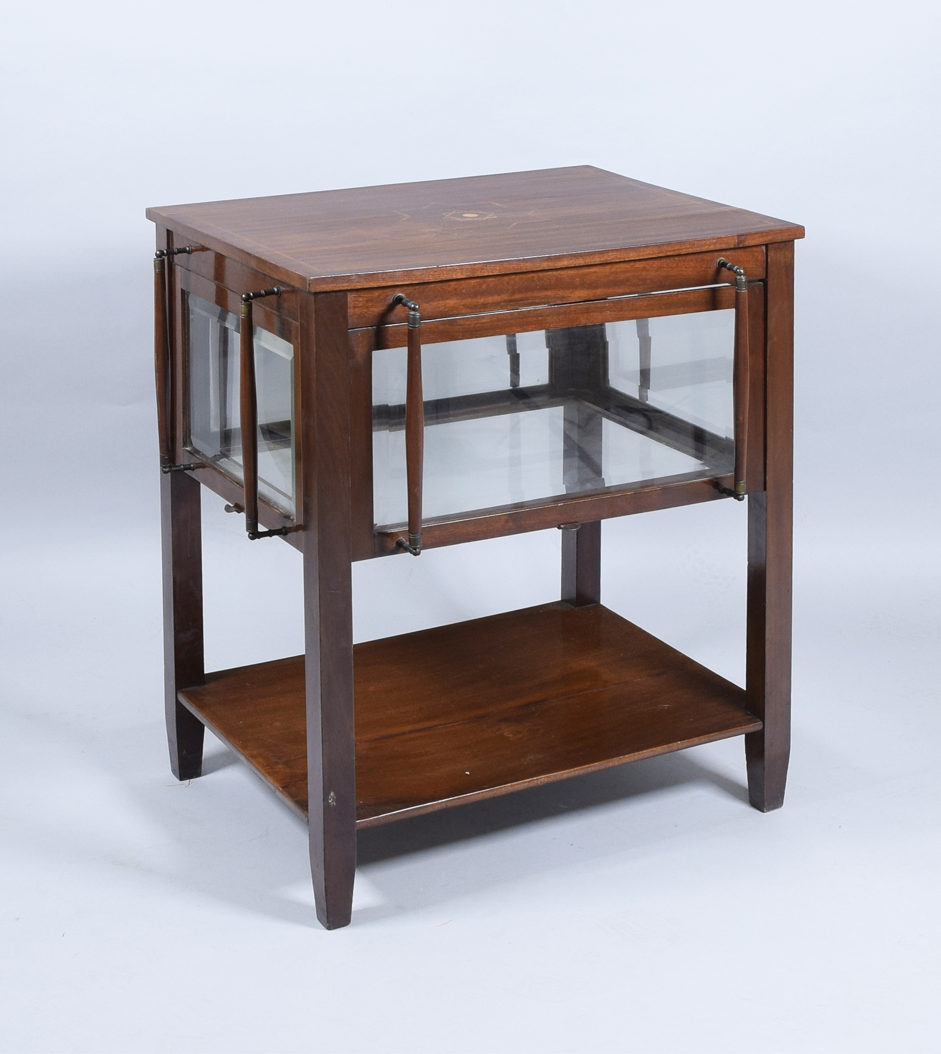 mahoń, róża, bukszpan, macica perłowa, mosiądz, szkło; 76,5 x 67 x 53 cm.