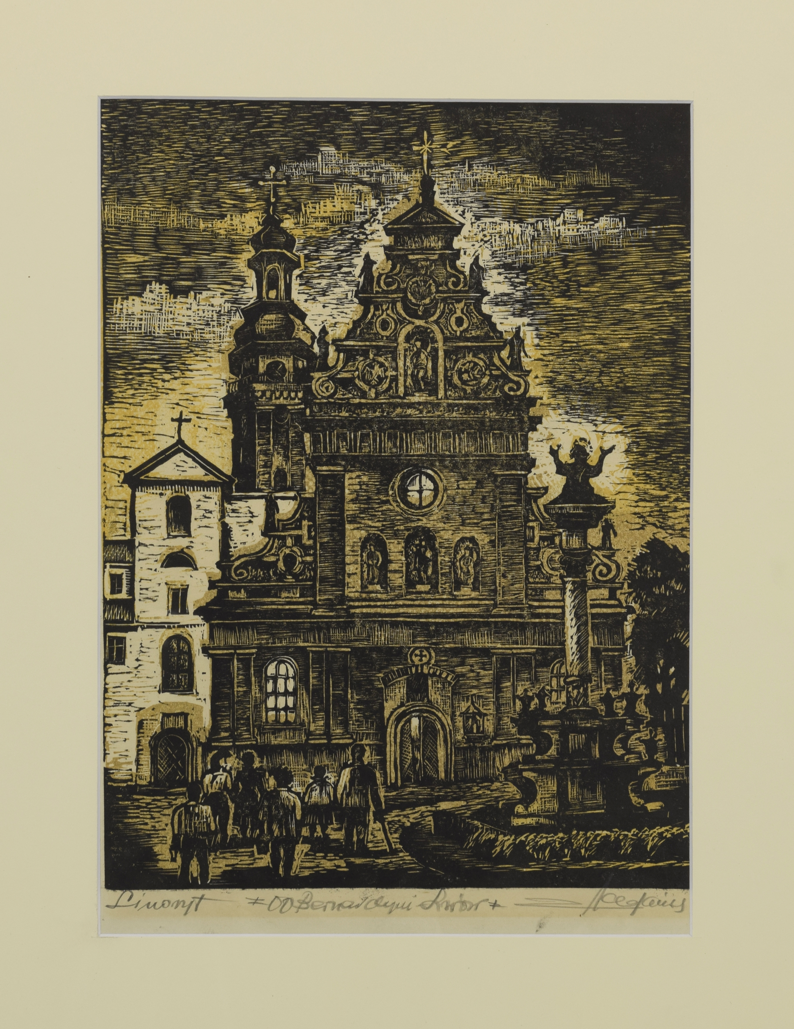 opis autorski wraz z sygnaturą u dołu: Linoryt OO Bernardyni Lwów ZAcedański (ołówkiem).
