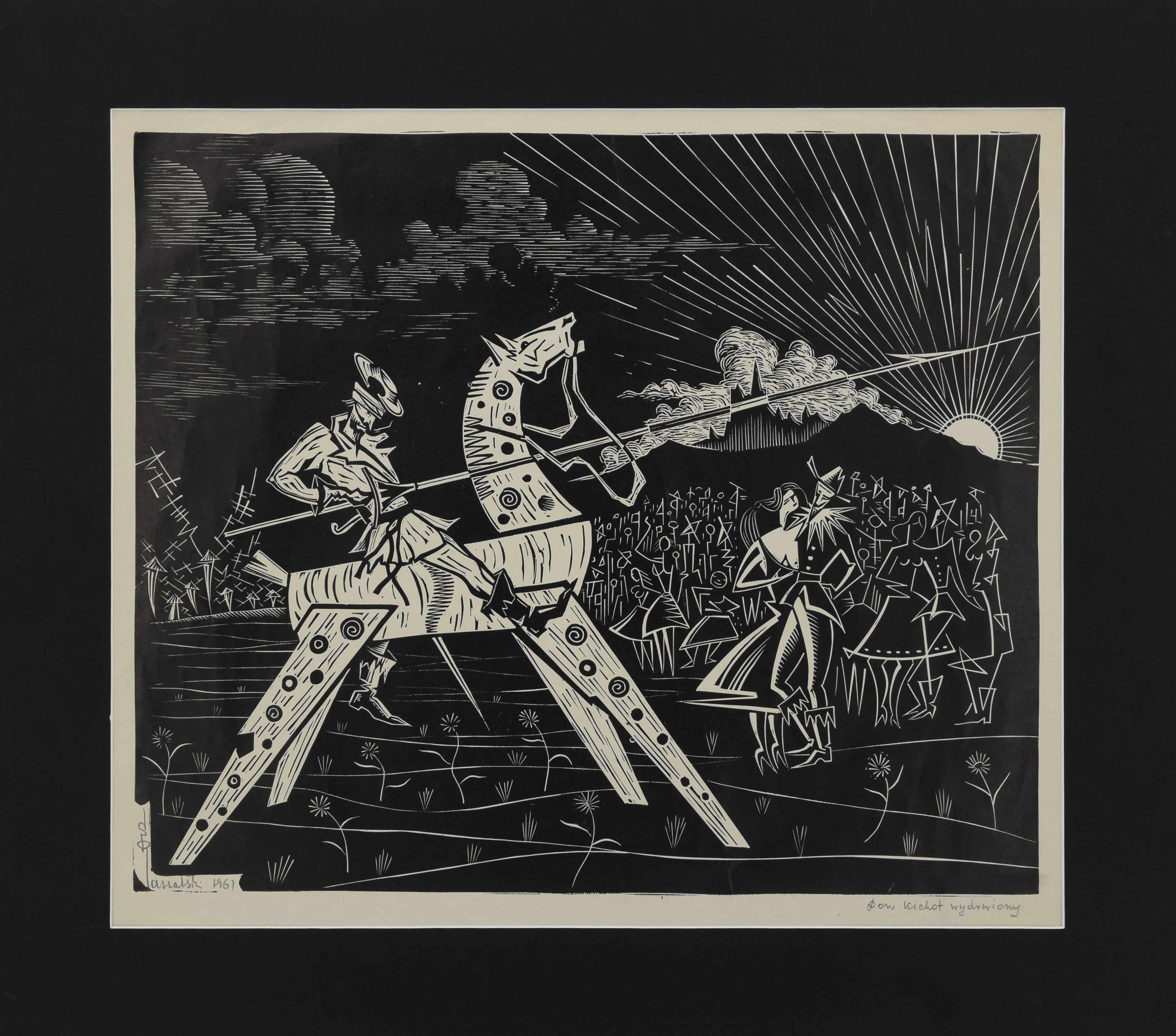 drzeworyt, papier; 37 x 43 cm (w świetle passe-partout o wymiarach 47 x 51 cm); sygn. i dat. l. d.: Rassalski 1961 (ołówkiem); oraz opisany p. d.: „Don Kichot wydrwiony”. Stefan Rassalski, ps. „Ster” (1910, Symonów - 1972, Warszawa) - polski fotograf, grafik, malarz, poeta, dziennikarz, żołnierz Armii Krajowej, autor licznych fotografii i artykułów poświęconych zniszczeniom wojennym Warszawy i powojennej odbudowie miasta. Twórczość jego pozostała pod dużym wpływem S. Kulisiewicza i W. Skoczylasa, uprawiał głównie technikę drzeworytu. Podczas wojny działał w konspiracji pod pseudonimem „Ster”. Współorganizował tajne laboratorium fotograficzne w podziemiach Wydziału Fizyki Politechniki Warszawskiej. Wykonywał tam mikrofilmy opracowań teoretycznych polskich naukowców, aby można je było łatwiej ukryć przed Niemcami. Pracował przy wyrabianiu fałszywych dokumentów tożsamości na potrzeby konspiracji oraz wykonywał za pomocą teleobiektywów dokumentację niemieckich zbrodni na ulicach Warszawy i portrety gestapowców na potrzeby podziemia. Podczas powstania warszawskiego Stefan Rassalski przebywał w rejonie Politechniki, gdzie o godzinie W wykonał pierwsze zdjęcie, przedstawiające zbiórkę grupy powstańców z kilku niekompletnych oddziałów w ogrodach uczelni. Nigdy nie wstąpił do PZPR, ale uniknął represji z powodu swojej wojennej działalności konspiracyjnej.