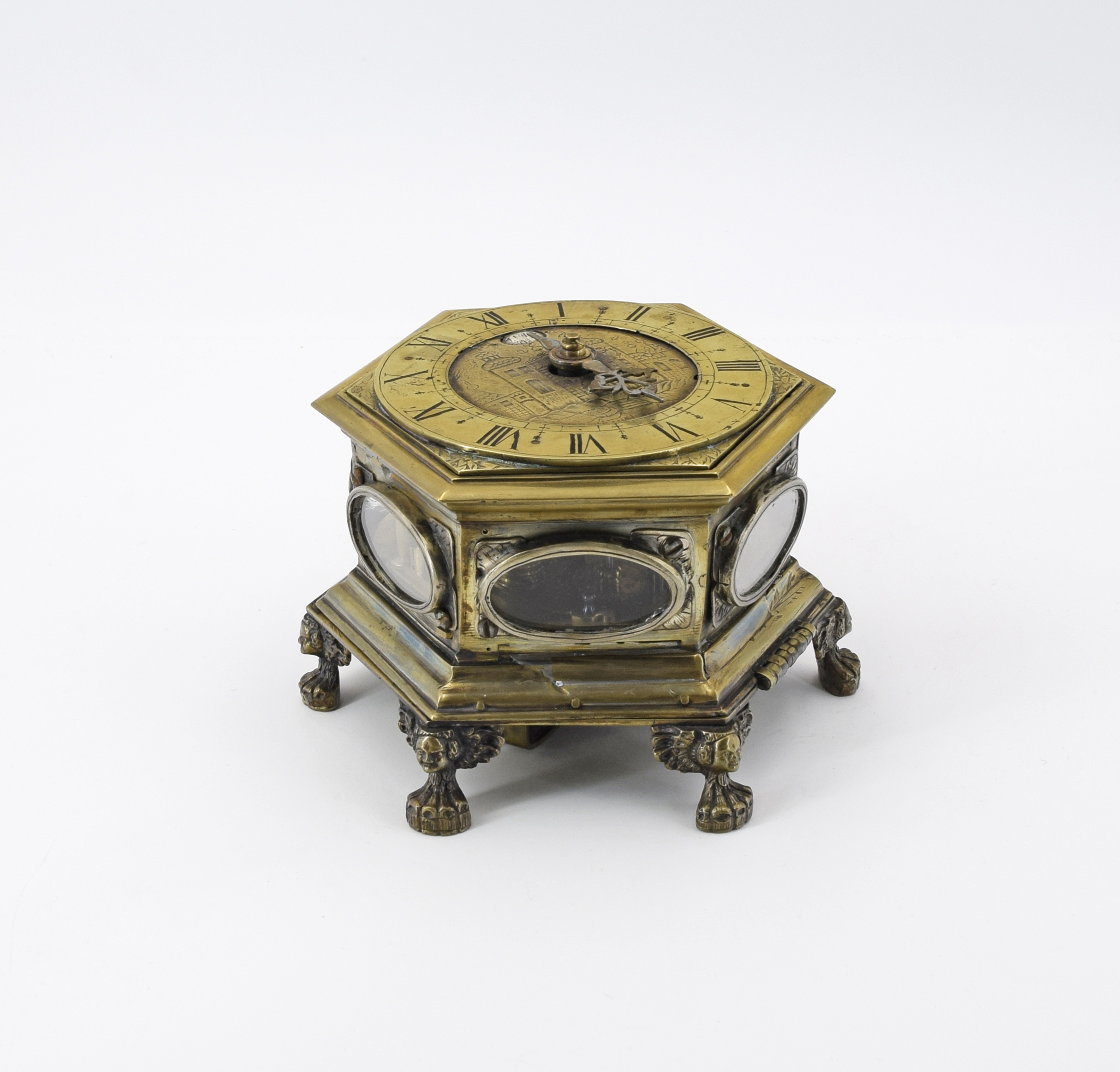 mechanizm: mosiądz, stal; dzwonek: spiż; obudowa: mosiądz złocony i srebrzony; odlewanie cyzelowanie, wycinanie, grawerowanie, srebrzenie; 11 x 16,4 x 14,5 cm; tarcza: 12,4 x 10,8 cm; pierścień cyfrowy: o 10,8 cm, szer. 2 cm;