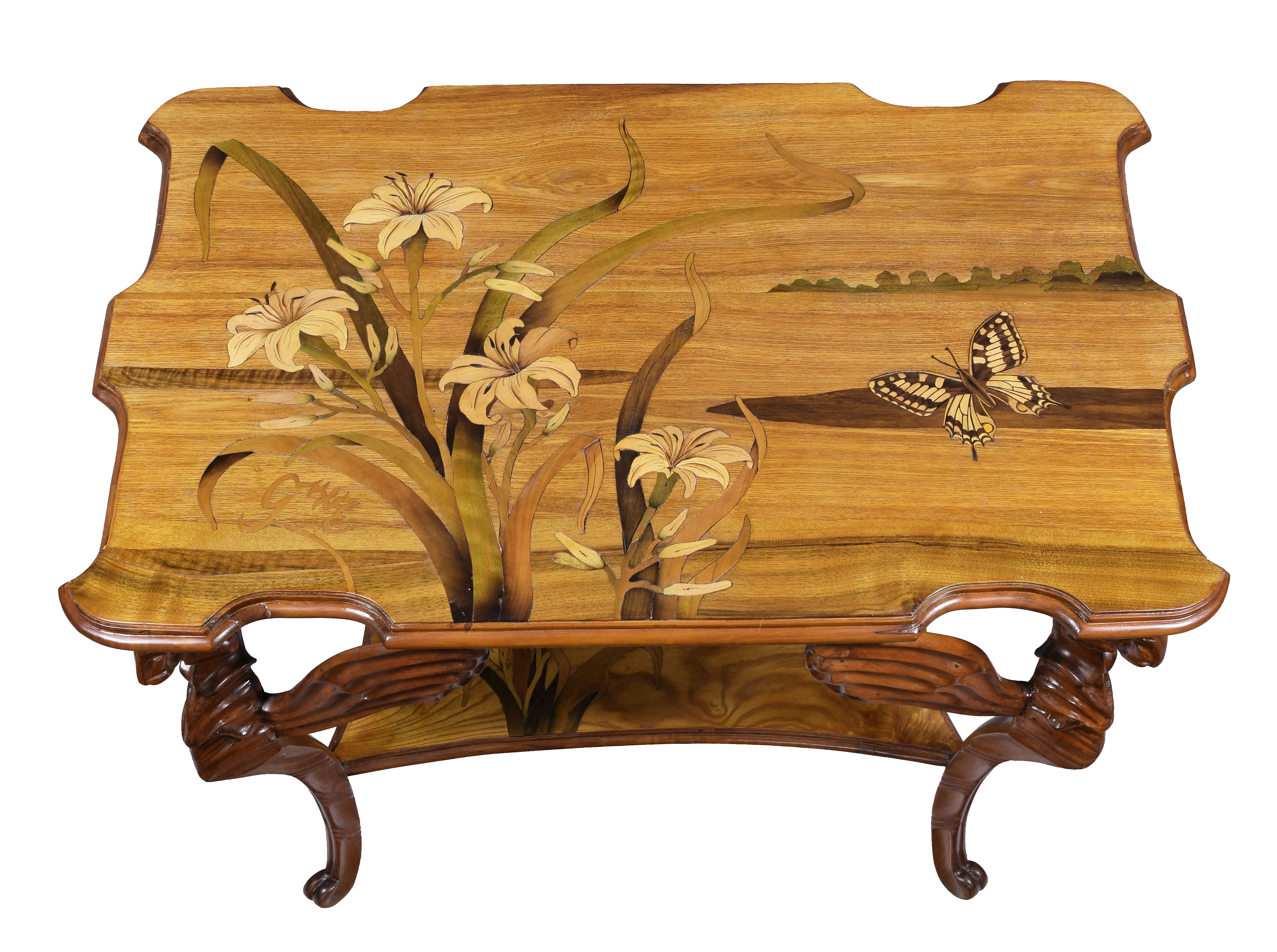 jesion, jawor, orzech; 78 x 89,5 x 58,5 cm. Francja, 1 poł. XX w. W stylu mebli wykonywanych przez Émile Gallé-go, z niewielkim dekoracyjnym blatem o falistym zarysie i profilowanym obrzeżu, wspartym na rzeźbionych, silnie stylizowanych korpusach ważek ze skrzydłami rozłożonymi na boki, spiętych u dołu podobną do blatu półką, intarsjowany barwionymi okleinami imitującymi kwiaty i liście lilii oraz motyle umieszczone na tle wody, z intarsjowaną sygnaturą na blacie „Gallé”. Émile Gallé (1846-1904) - wybitny francuski projektant szkła, mebli i biżuterii w stylu secesyjnym, założyciel szkoły w Nancy (1890-1914). Jego meble (wykonywane w Nancy od 1886 r.) charakteryzowały się lekkością, falistymi formami oraz naturalistycznymi dekoracjami, często ułożonymi na meblach asymetrycznie zaczerpniętymi ze świata roślin i zwierząt, wykonanymi w formie rzeźbiarskiej i intarsjowanej z wykorzystaniem egzotycznych gatunków drzew. Wykonywane przez niego wyroby były bardzo popularne. Po jego śmierci produkcję do 1931 roku kontynuował jego syn chrzestny prof. Pedrizet, w późniejszym zaś okresie powstawało wiele naśladownictw w całej Europie. Oryginalne meble, które wyszły z jego pracowni charakteryzuje subtelna dekoracja intarsjowana, ale też precyzyjna snycerka, wielowymiarowa. Prezentowany stolik wykonany został w oparciu o autentyczny model autorski, nie ma jednak takiej delikatności jak oryginalne prace artysty.