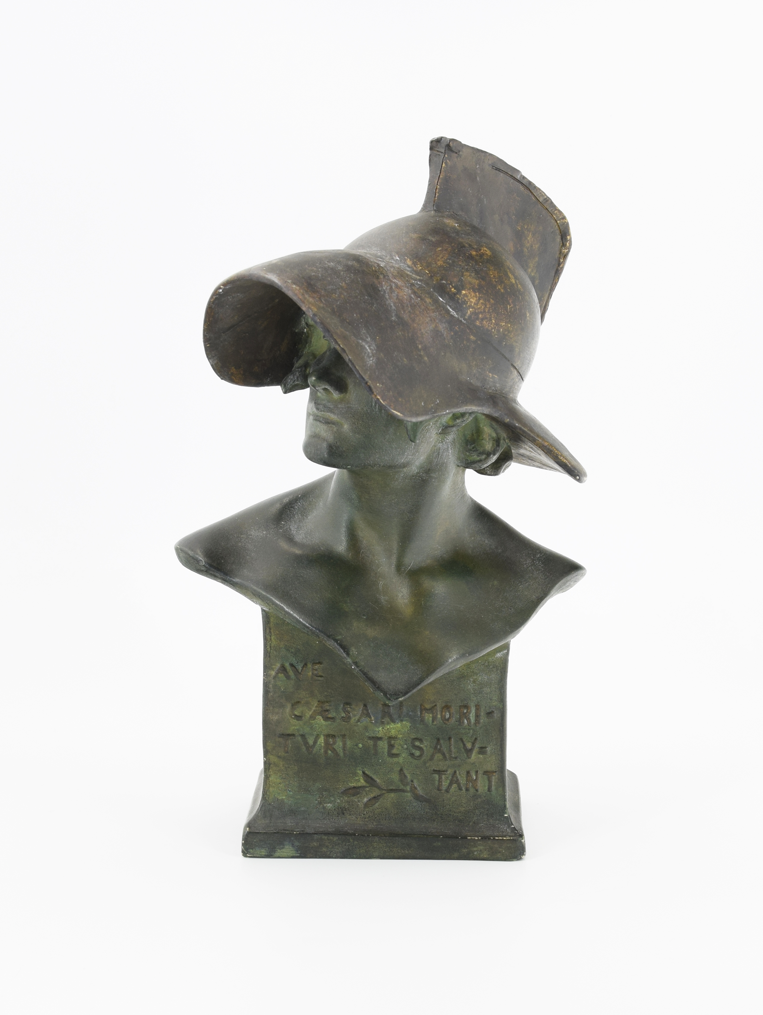 terakota patynowana w kolorze grynszpanu miedzi (twarz, tors, cokół) i brązu (hełm); wys. 29 cm;