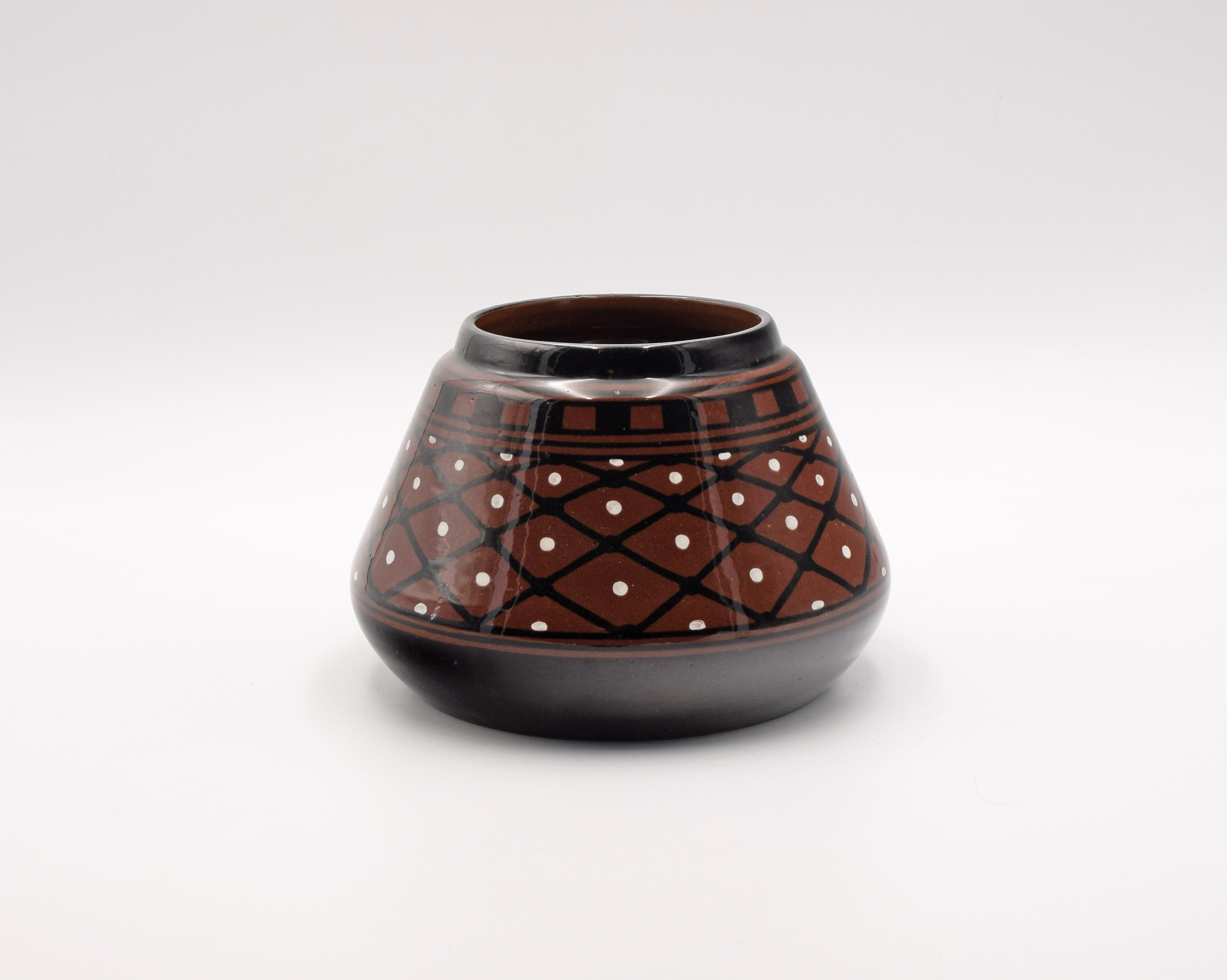 ceglasta glinka ceramiczna, farby podszkliwne (czerń, biel), szkliwo ołowiowe;