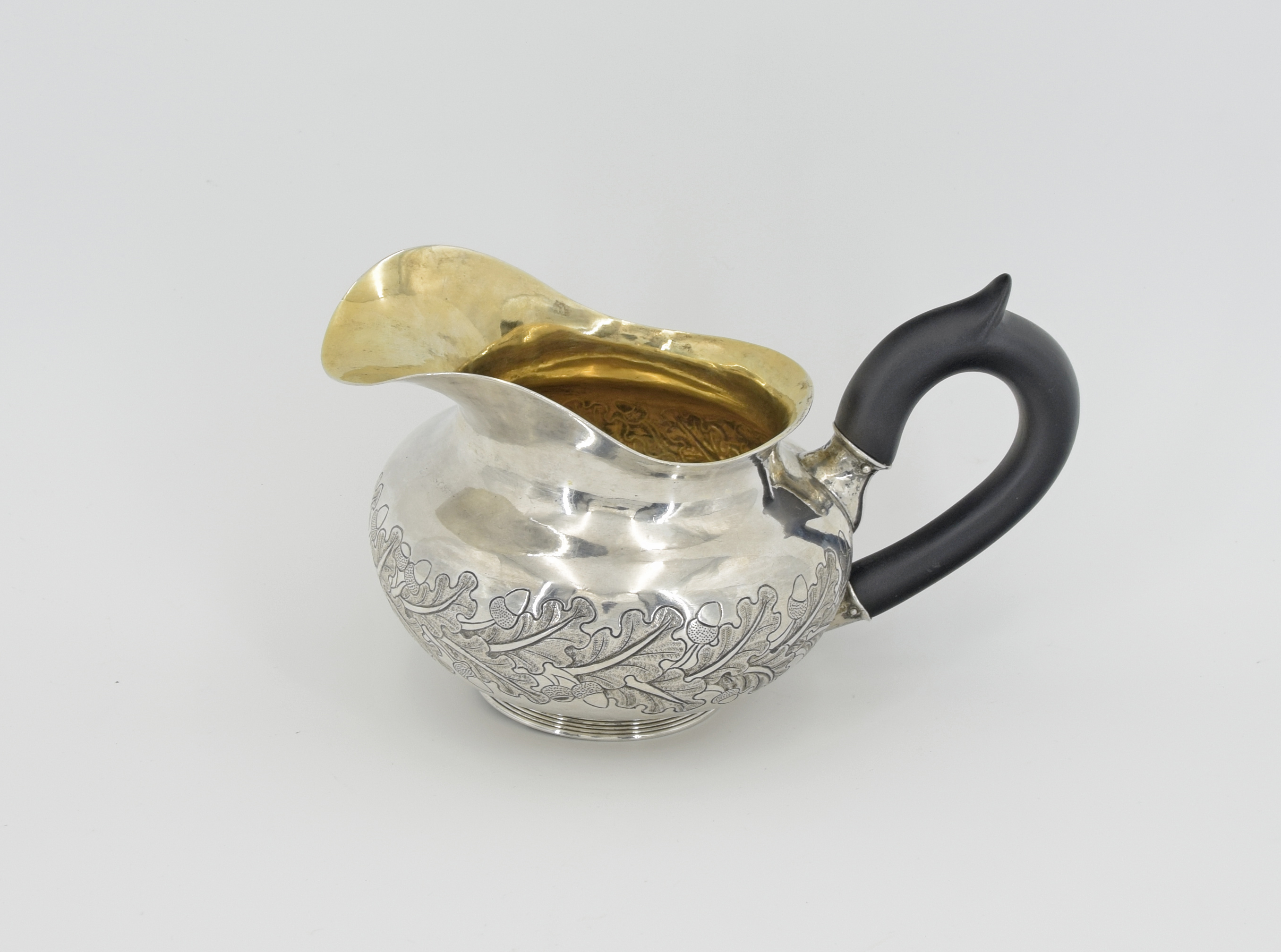 srebro próby 12,częściowo złocony cechowany; wys. 9, 6 cm, szer. 17,5 cm, głęb. 11,5 cm; waga 290 g.