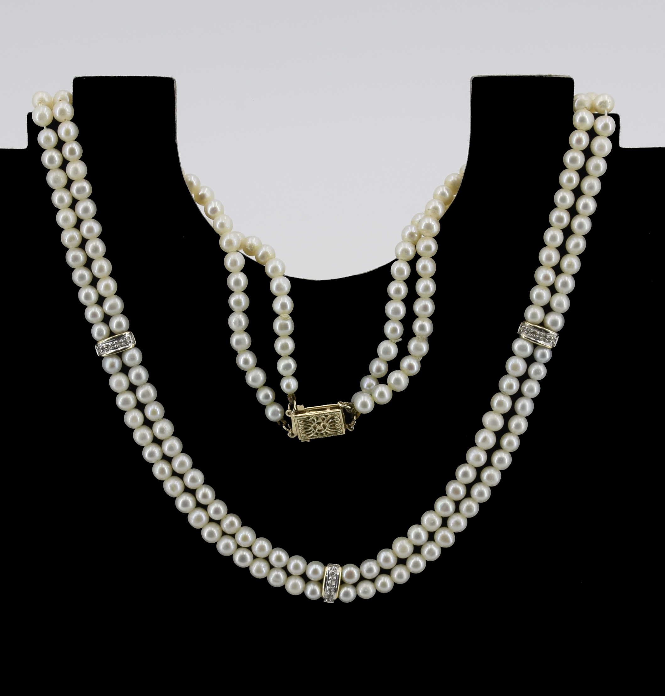 podwójny naszyjnik z pereł hodowanych, słodkowodnych + 9 szt. diamentów w szlifie 8/8;