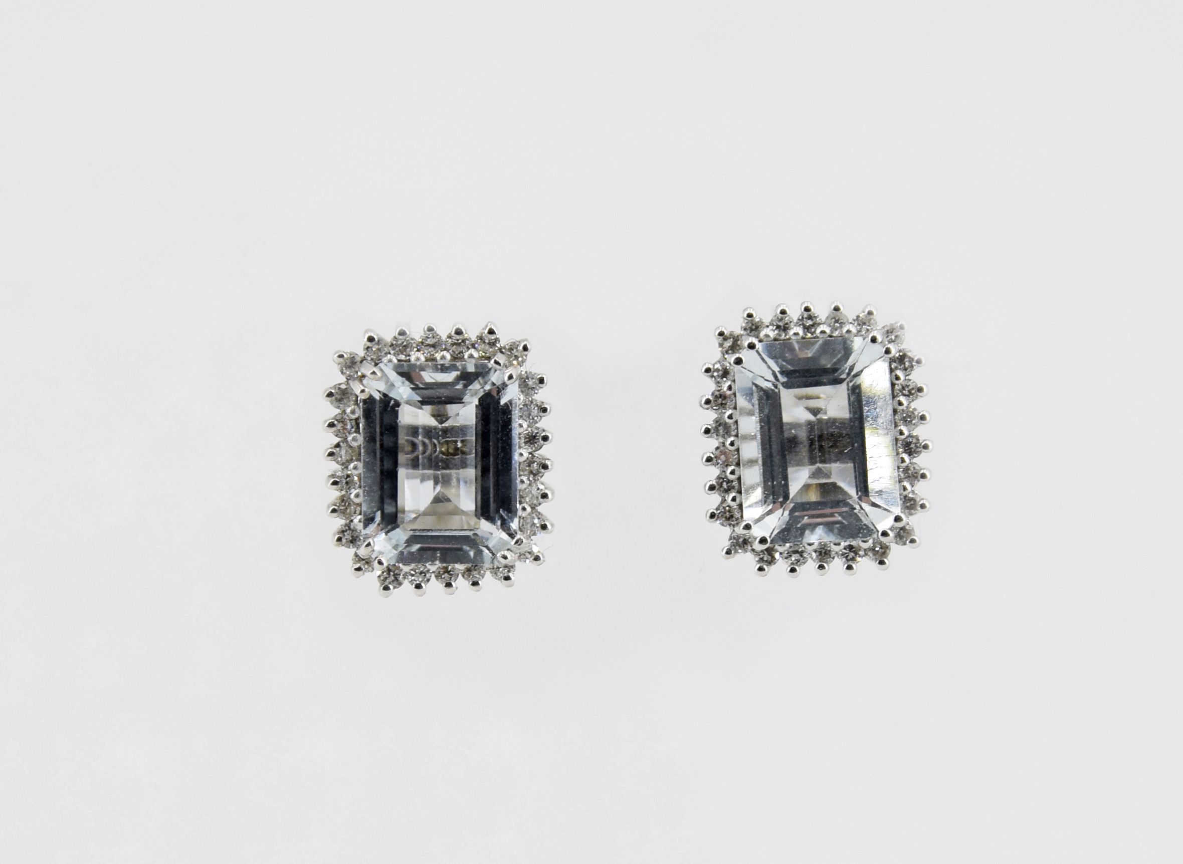 akwamaryny o masie łącznej ok. 4.00 ct w otoczeniu 52 szt. brylantów;