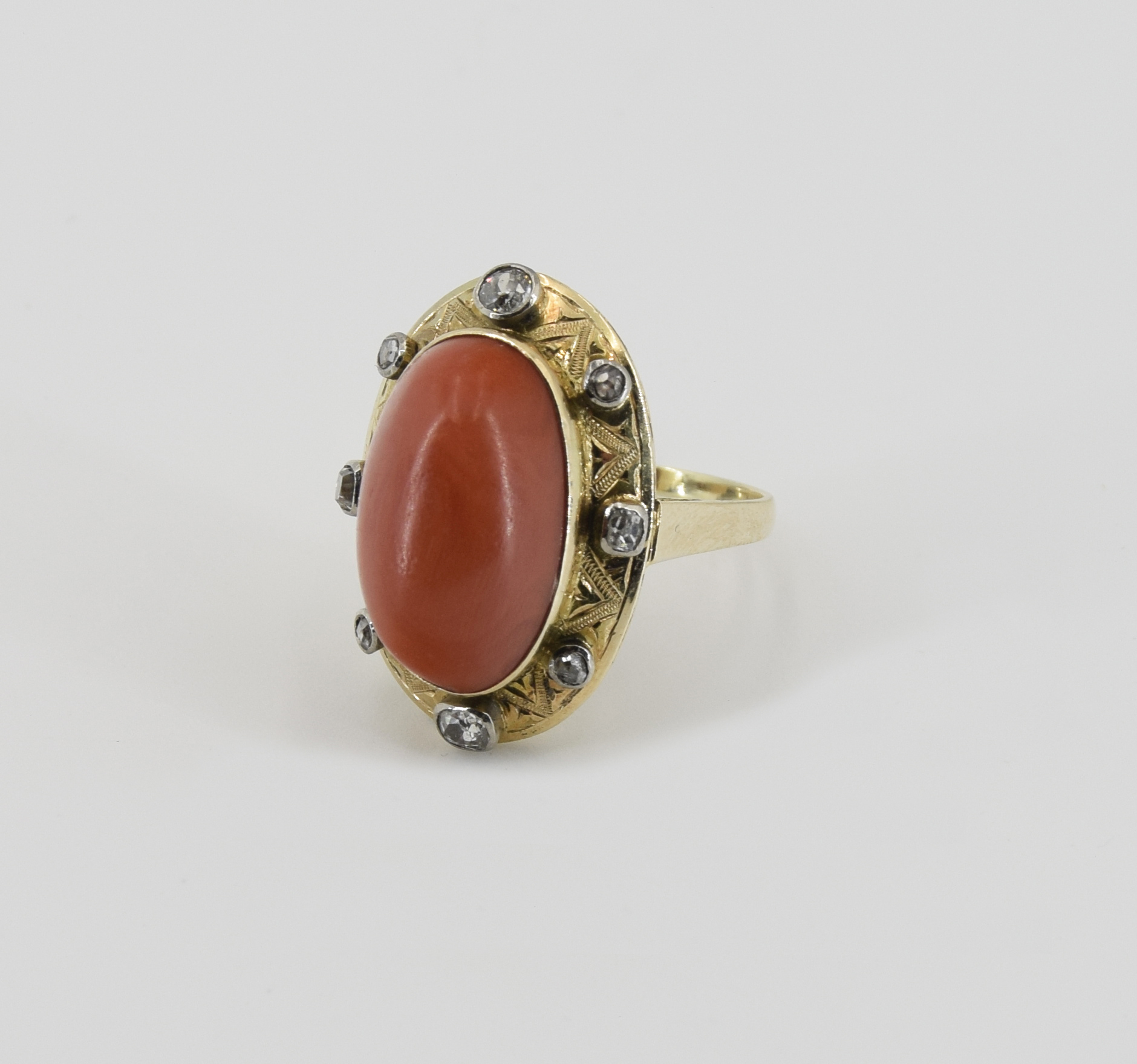 koral w szlifie kaboszon + 4 szt. diamentów oraz 4 szt. rautów diamentowych;