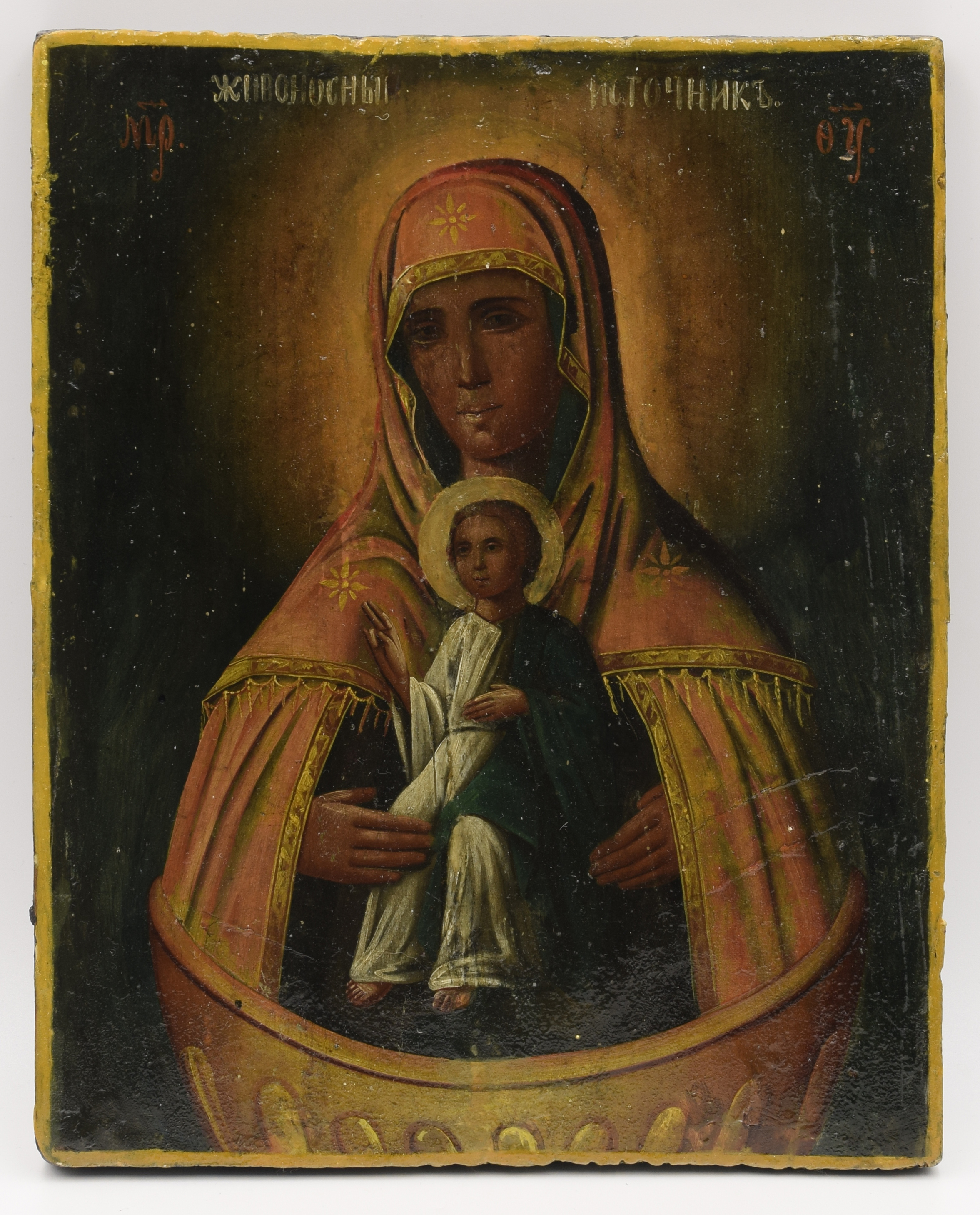 olej, deska, podkład kredowo-gipsowy; 29,8 x 24 x 1,9 cm; Ukraina, XIX w. Pole ikony ujęte żółtym pasem. Przestawienie ilustruje cudowną moc źródła w greckim miejscu pielgrzymkowym Balikli. Znaczenie tej ikonografii odnosi się nie tylko do historycznych relacji o Świętym Źródle z Konstantynopola, ale także do postrzegania Jezusa jako „źródła życia“. Ikona ukazuje Bogarodzicę z Chrystusem Emmanuelem na piersiach, w czaszy kielicha, co jest nawiązaniem do kielicha eucharystycznego. Matka Boża obejmuje Syna obiema rękoma, Zbawiciel unosi prawą dłoń w geście błogosławieństwa. Trzy gwiazdki na szalu osłaniającym Matkę Bożą wskazują na Jej dziewictwo przed, w czasie i po narodzeniu Jezusa Chrystusa. Nad świetlistym nimbem Bogarodzicy monogram MP OY, co jest skrótem od greckich słów „MHTHP OEOY” - Matka Boga. U góry napisy objaśniające cyrylicą "Życiodajne Źródło".