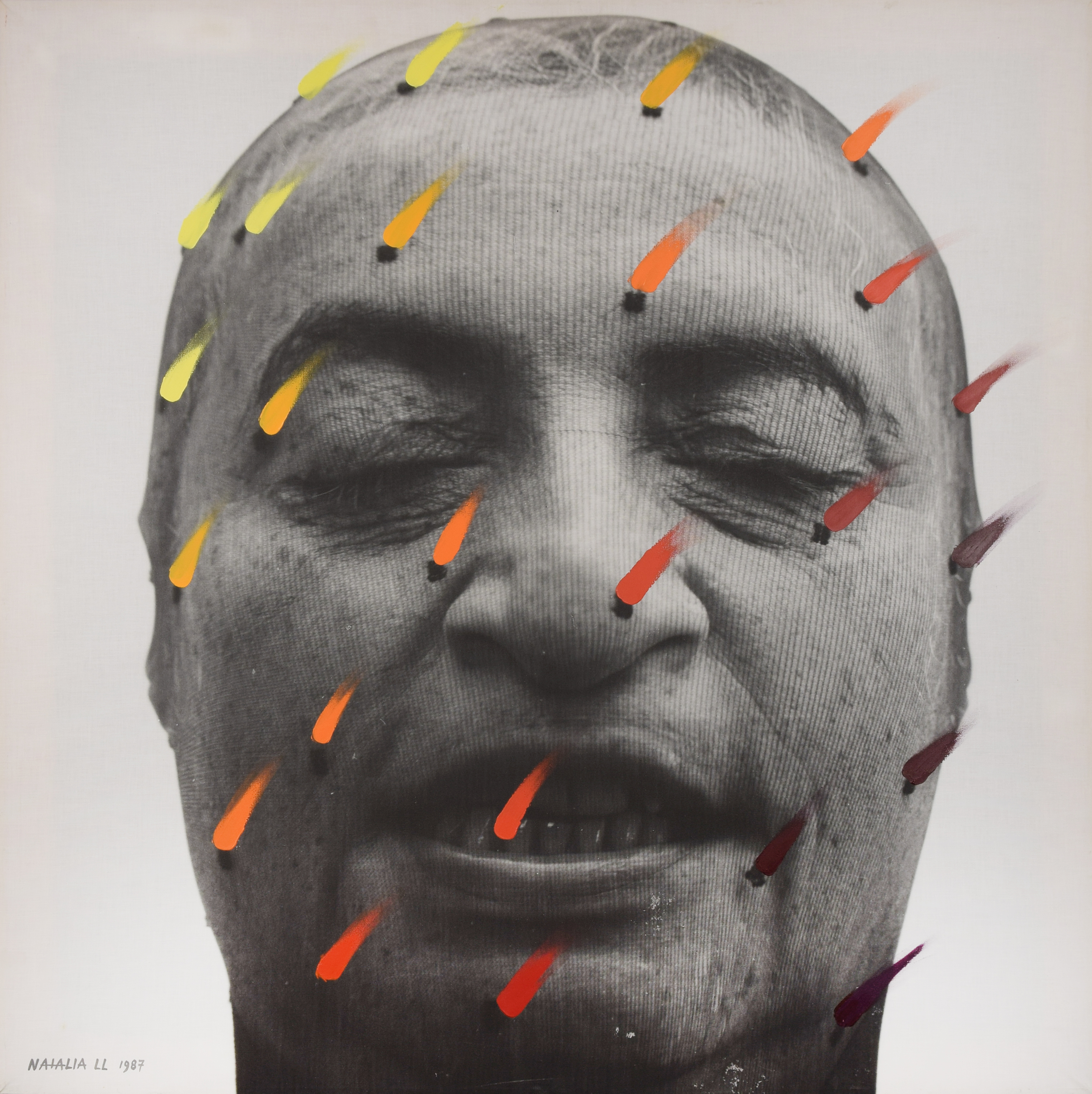 fotografia na płótnie, akryl; 105 x 105 cm; sygn. i dat. l.d.: NATALIA LL 1987 opisany na odwrocie, na blejtramie: NATALIA LL "GŁOWA MISTYCZNA xi" 1987 / Photocanvas + Akryl Wystawiana i reprodukowana: Natalia LL. Sum ergo sum. Retrospektywa, katalog wystawy, 19 maja - 1 października 2017, Centrum Sztuki Współczesnej „Znaki Czasu”, Toruń 2017; Nord Art 2022. International Art Exhibition. 200 artists from around the world, Jun 4 - October 10, Kunstwerk Carlshutte, Budelsdorf, Niemcy, Budelsforf 2022, s. 45.