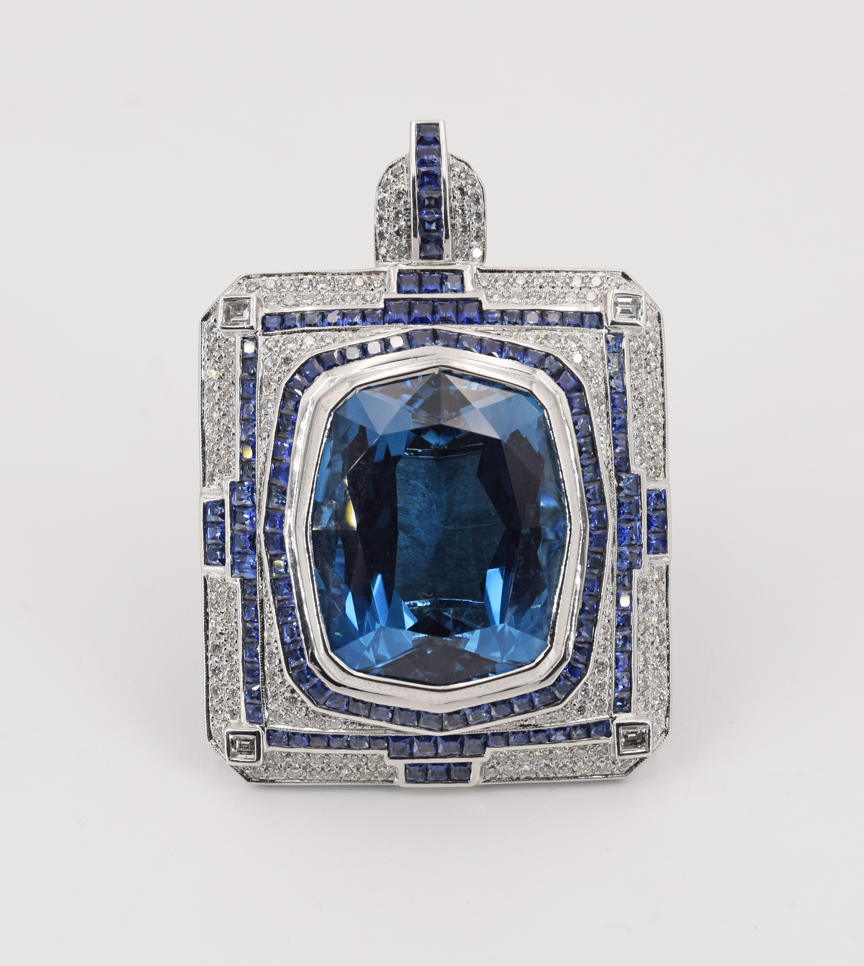 topaz London Blue o masie ok. 100.00 ct oraz 172 szt. brylantów, 138 szt. szafirów i 4 szt. diamentów;
