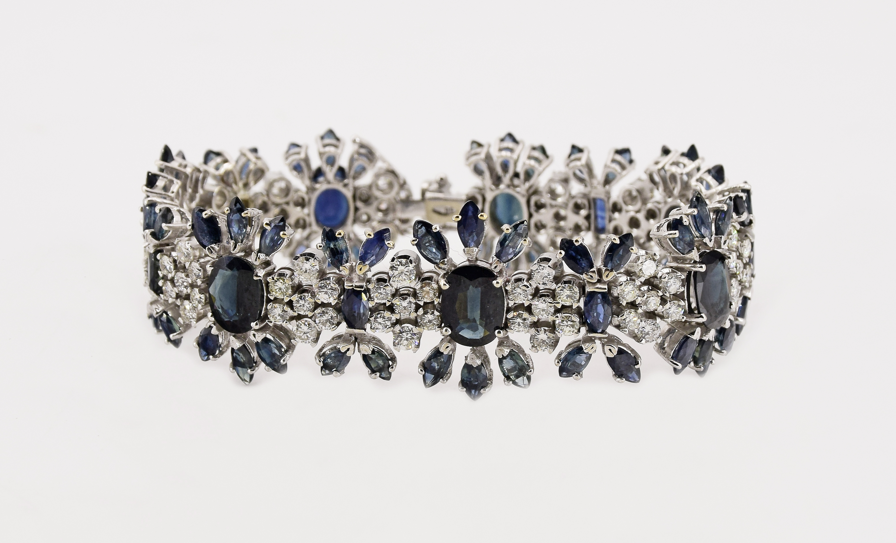 ciemnoniebieskie szafiry o masie łącznej ok. 25.00 ct oraz brylanty o masie łącznej ok. 4.55 ct;