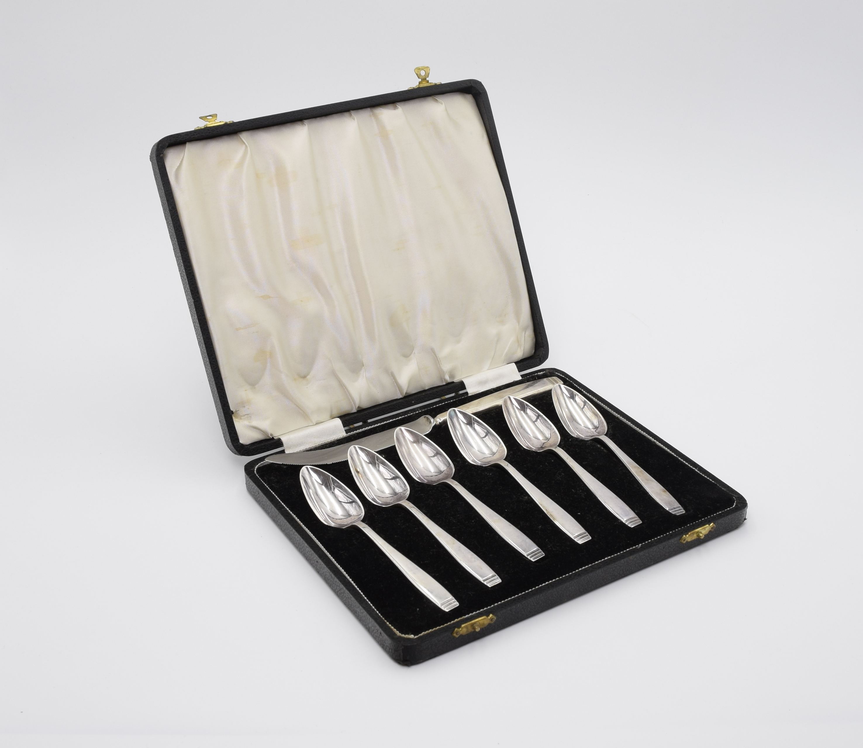 plater, stal nierdzewna; w składzie: 6 szt. łyżeczek - dług. 14,3 cm, nóż z wygiętym końcem ostrza, z dwustronnymi ząbkami piły - dług. 21,3 cm;