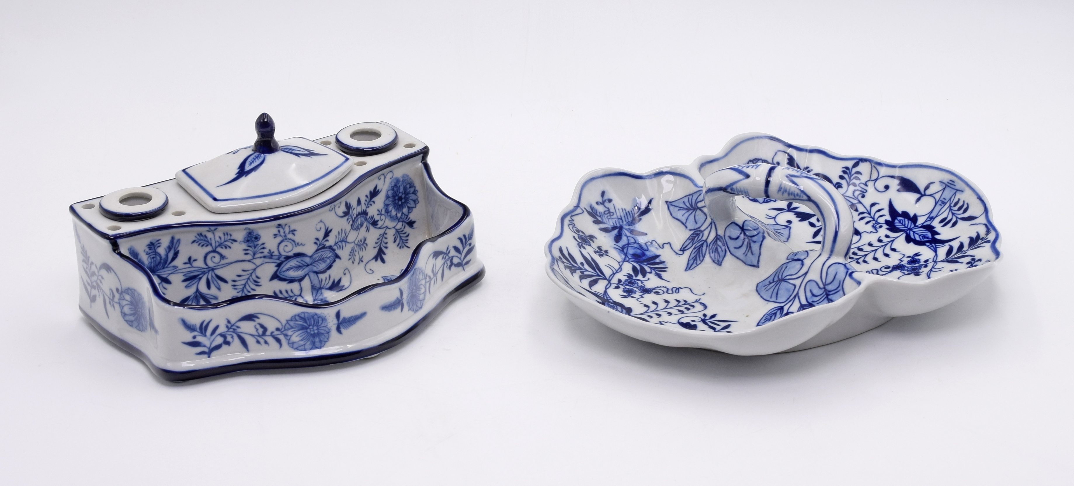 Porcelana, kobalt malowana podszkliwny; wymiary: kałamarza: 10,5 x 20 x 14 cm, patery: 10 x 26 x 21 cm.