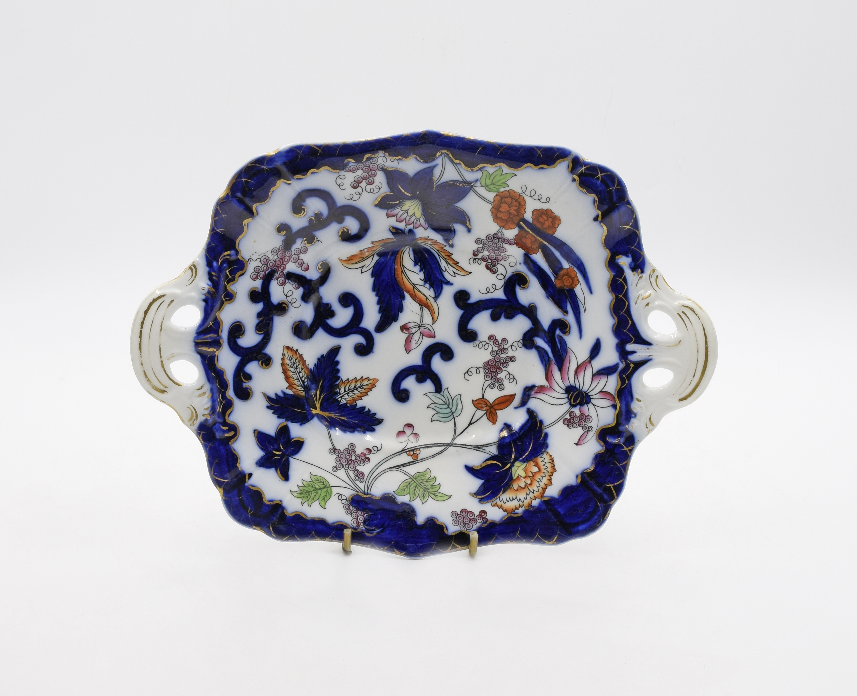 porcelana biała, kobalt podszkliwny, dekoracja kwiatowa naszkliwna (kalka), złocenie; 29 x 21 cm;