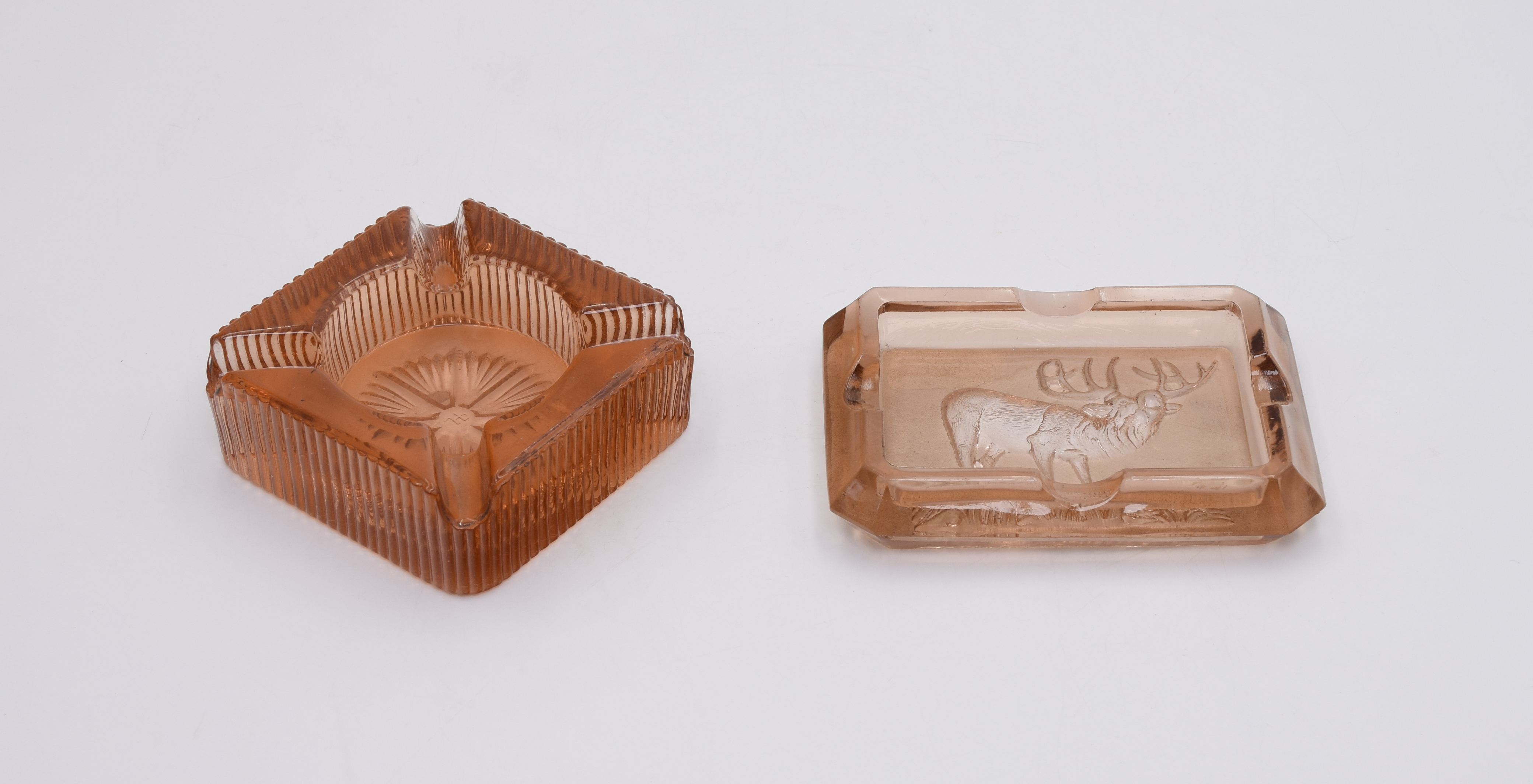 szkło lane, pomarańczowe, różowe; wym.: 4 x 11,3 x 11,3 cm, 3 x 14,7 x 11 cm.