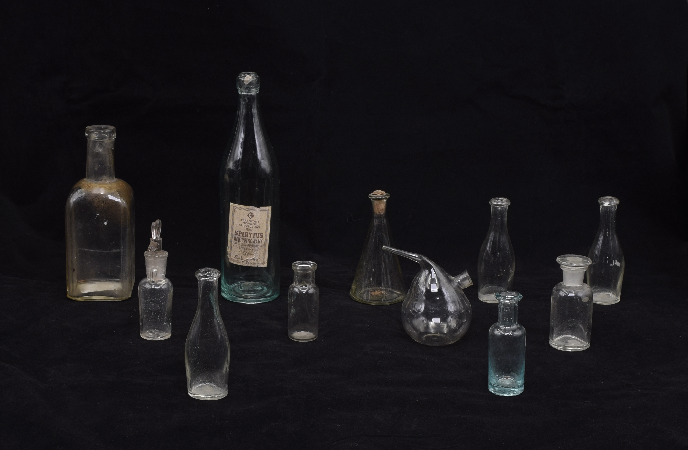 w składzie 11 szt. naczyń aptecznych ze szkła bezbarwnego, wys. od 7 cm do 21 cm.