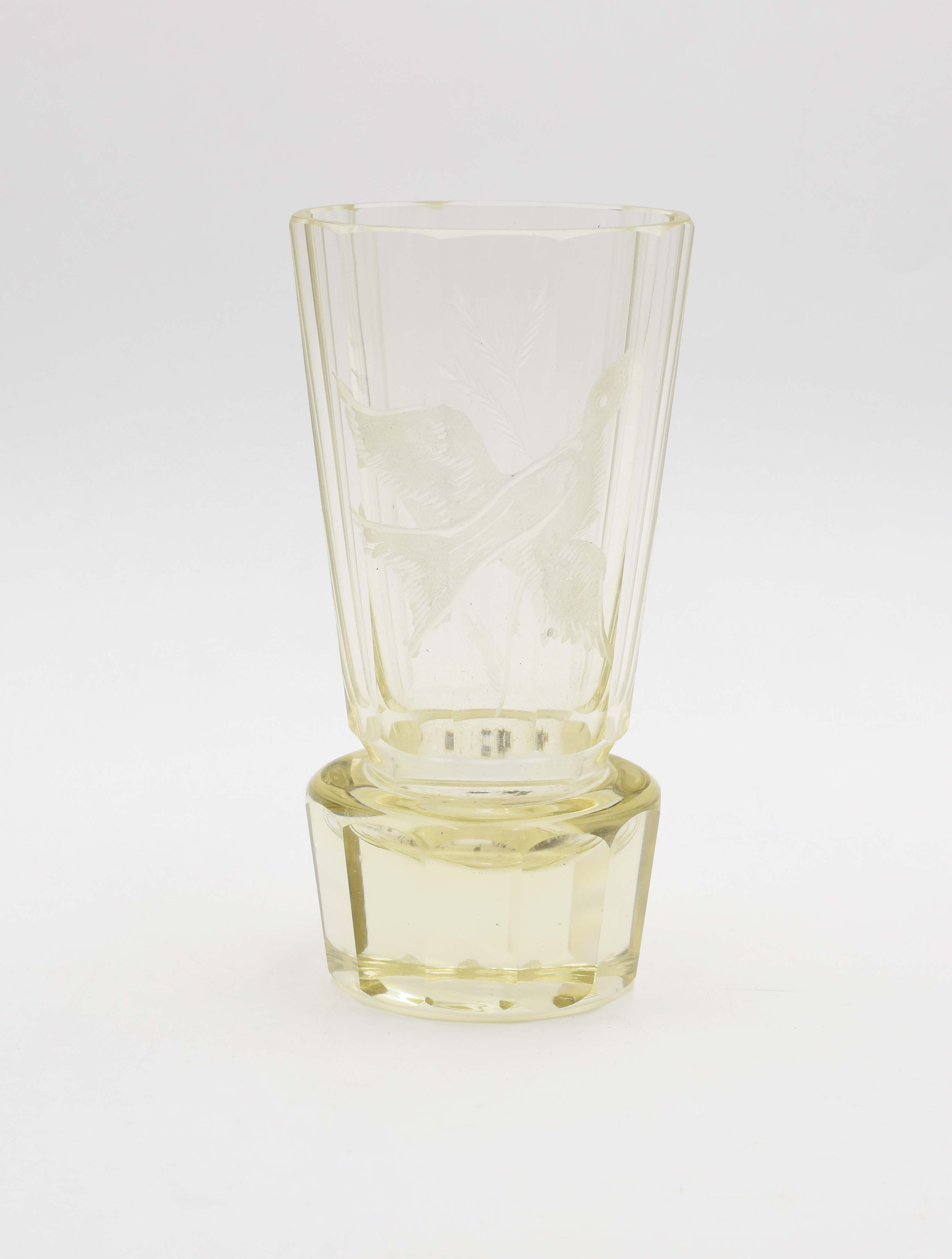 szkło przezroczyste o lekkim żółtawym zabarwieniu, szlifowanie; 16,5 x 8,8 x 8,8 cm.