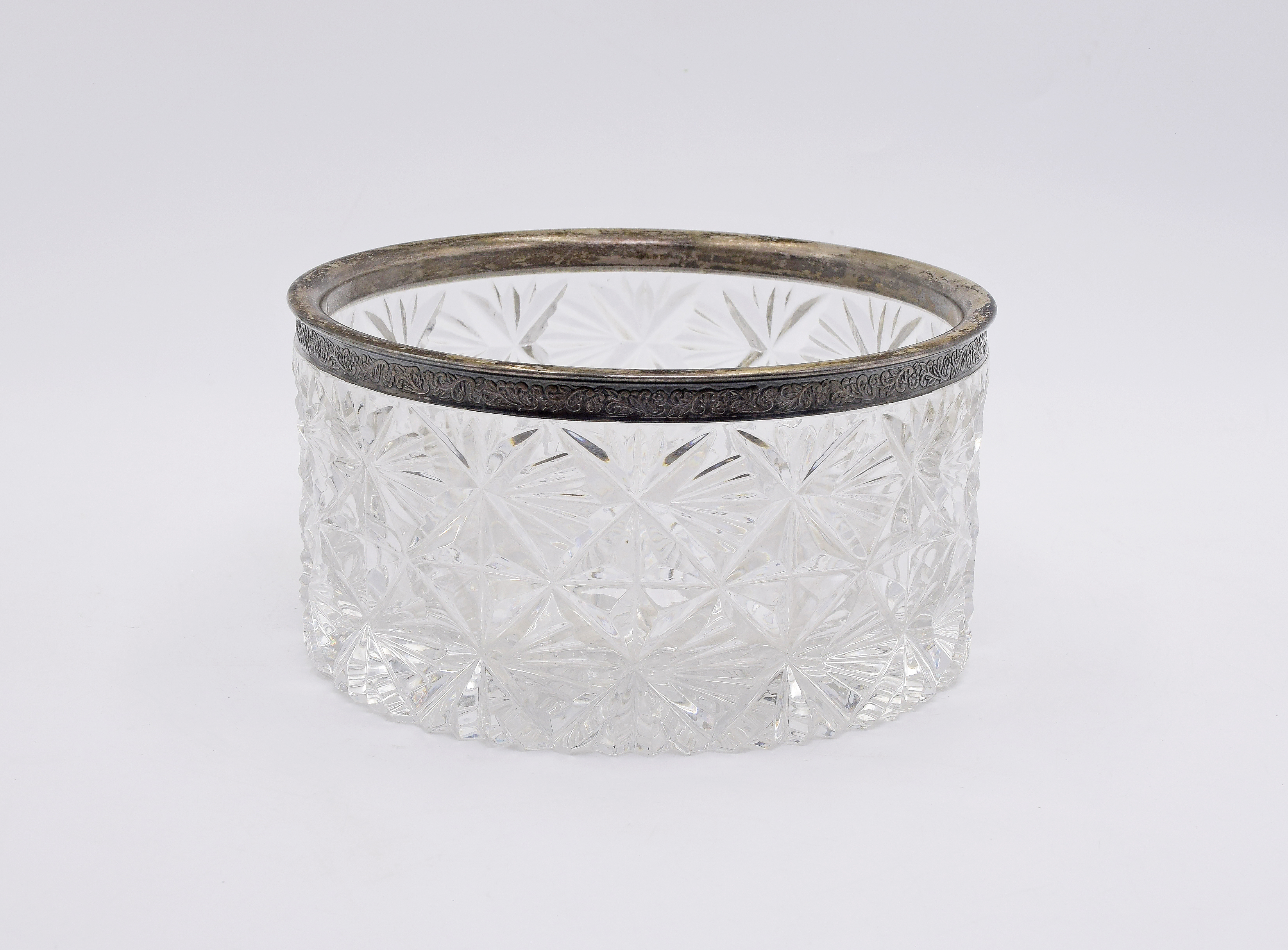 szkło prasowane, z „dekoracją kryształową”, przeźroczysta, mosiądz platerowany; 10,5 x 20 cm.