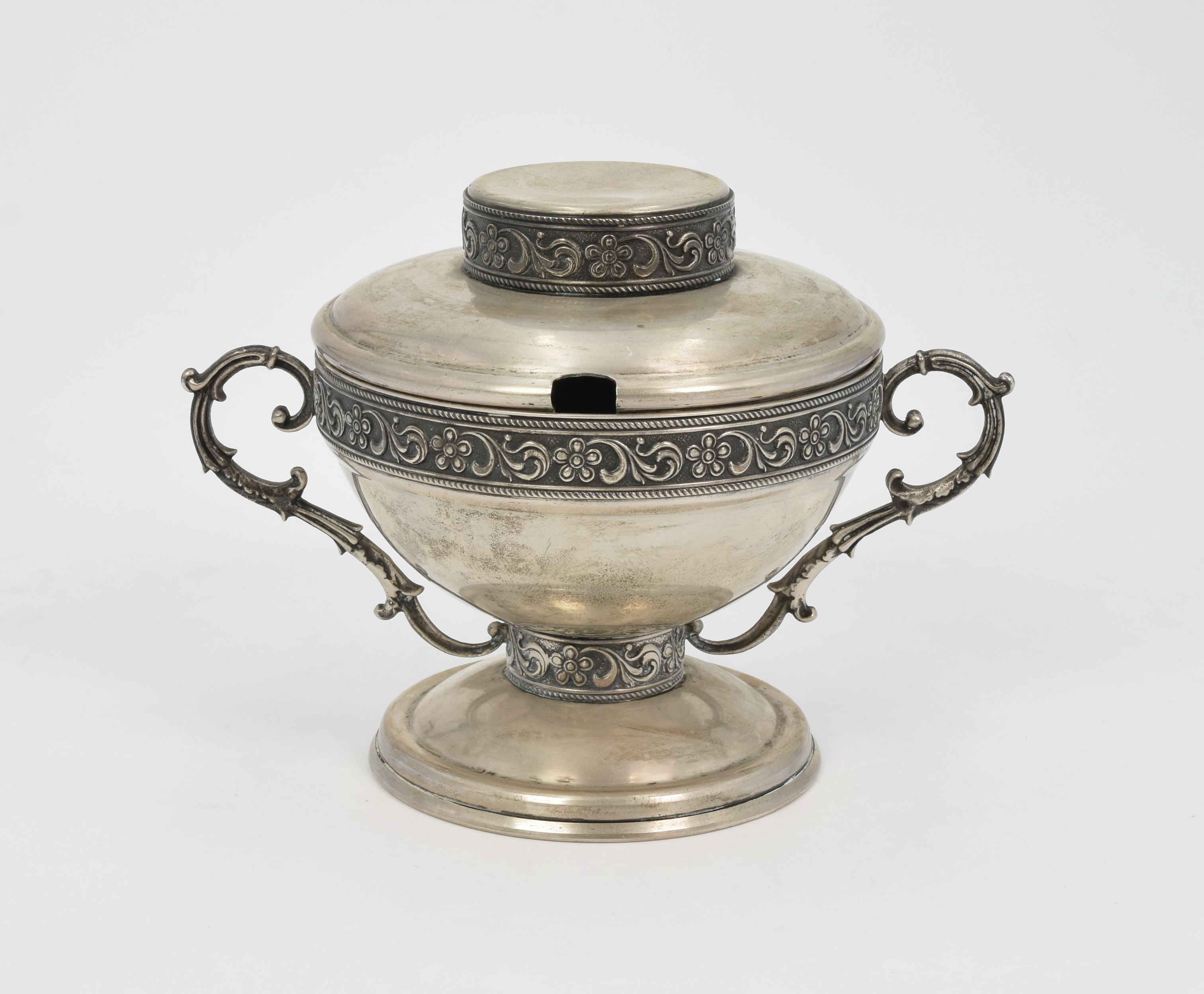 srebro pr. 3, cechowane [polska cecha srebra 1963-1986]; 11,5 x 15,5 x 10,5 cm, waga 375 g.