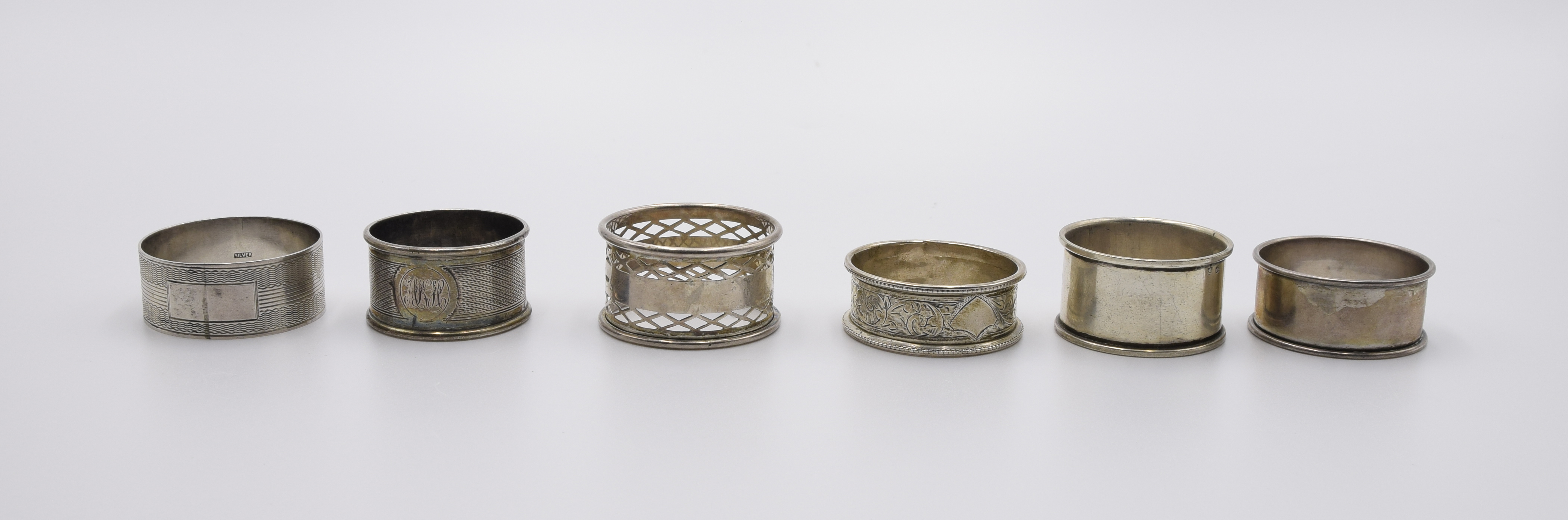 srebro (cechowane - 3 szt.), białe srebro (EPNS), plater (2 serwetniki);