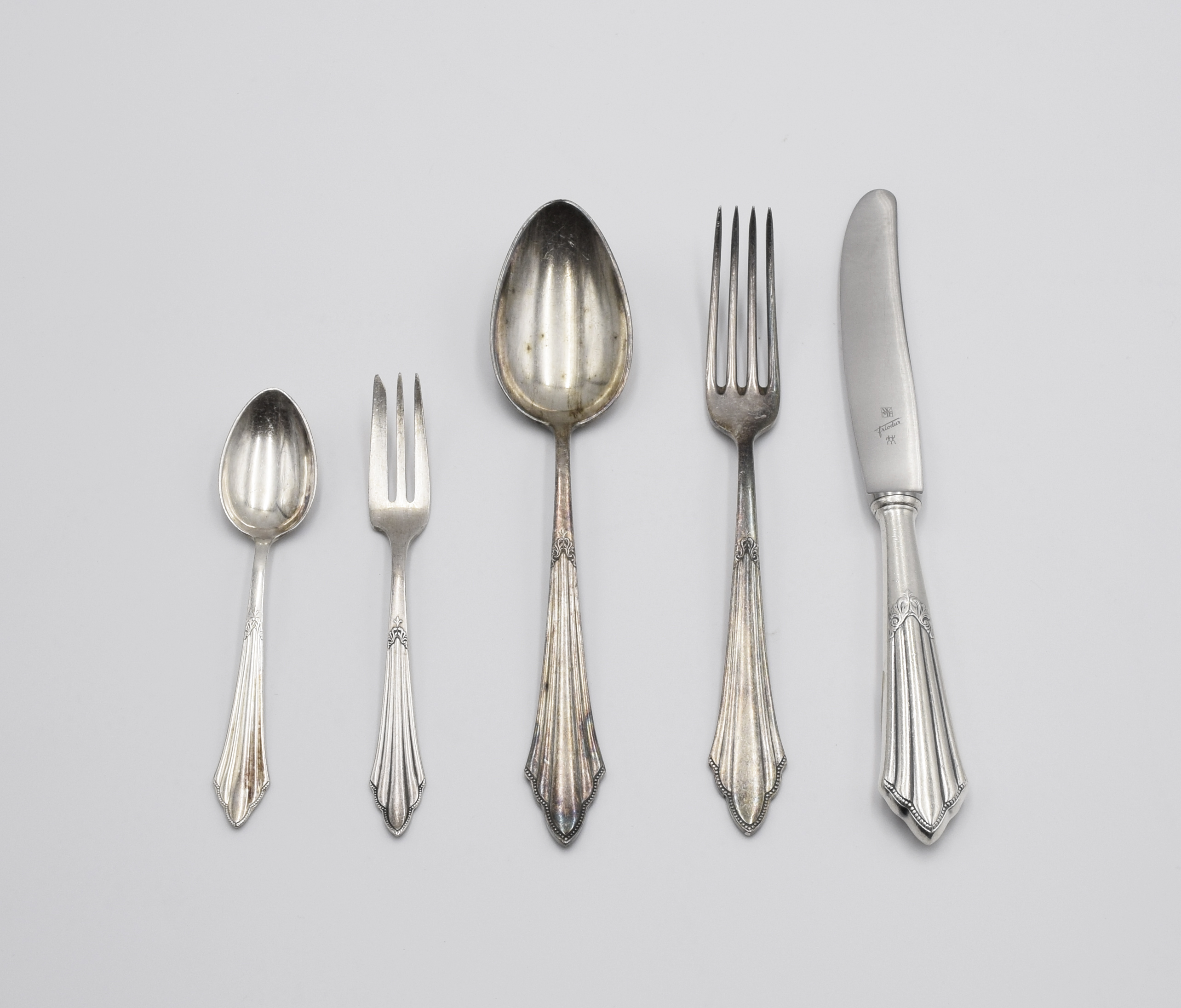 w składzie: łyżki do zupy (dł. 21 cm), widelce (dł. 20,4 cm), noże (dł. 23,5 cm), widelczyki do ciasta (dług. 15,8 cm), łyżeczki do herbaty (dł. 14 cm);