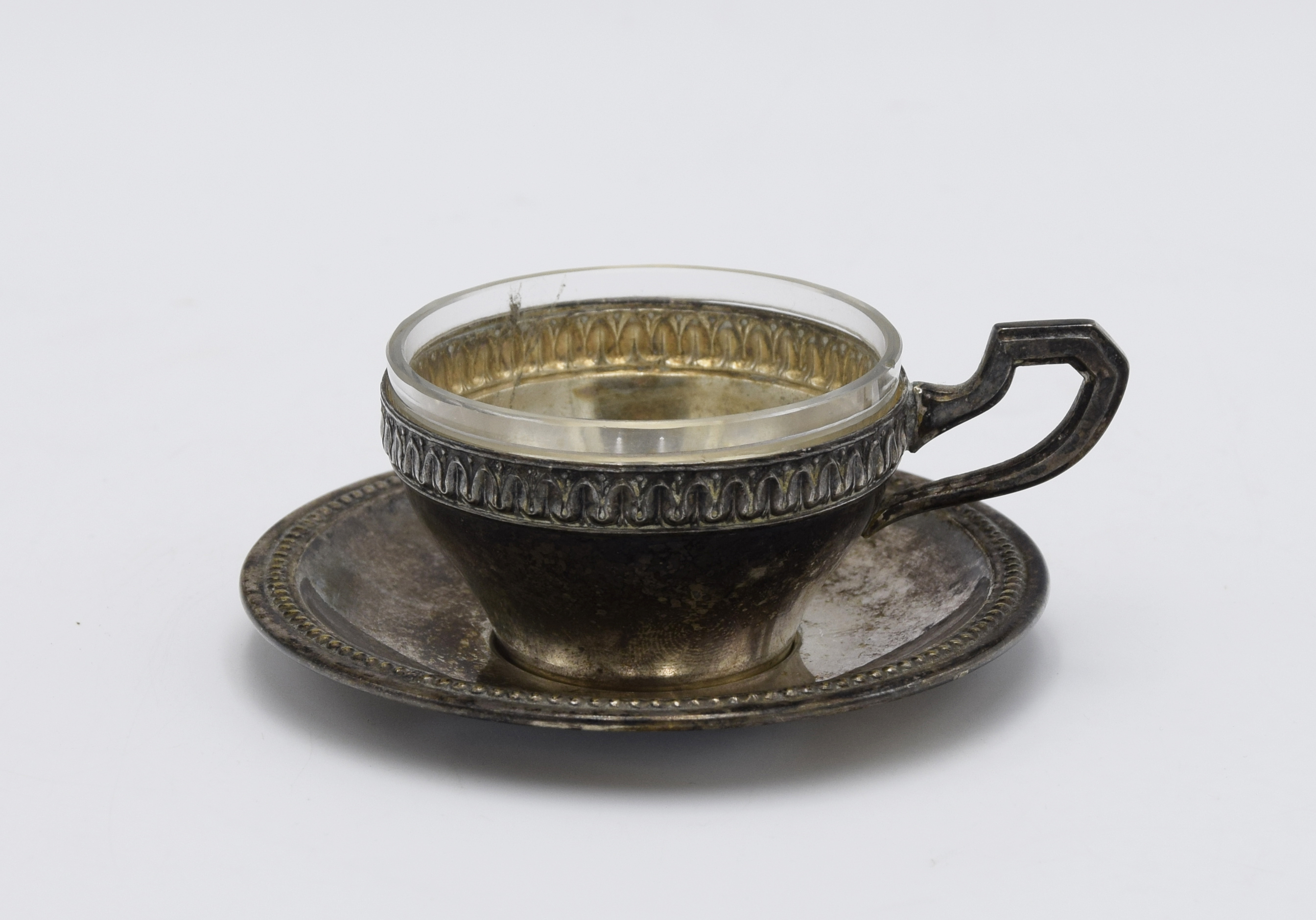 plater, wkład szklany; filiżanka z wkładem: 4 x 8,4 x 5,7 cm, śr. spodeczka: 9 cm.