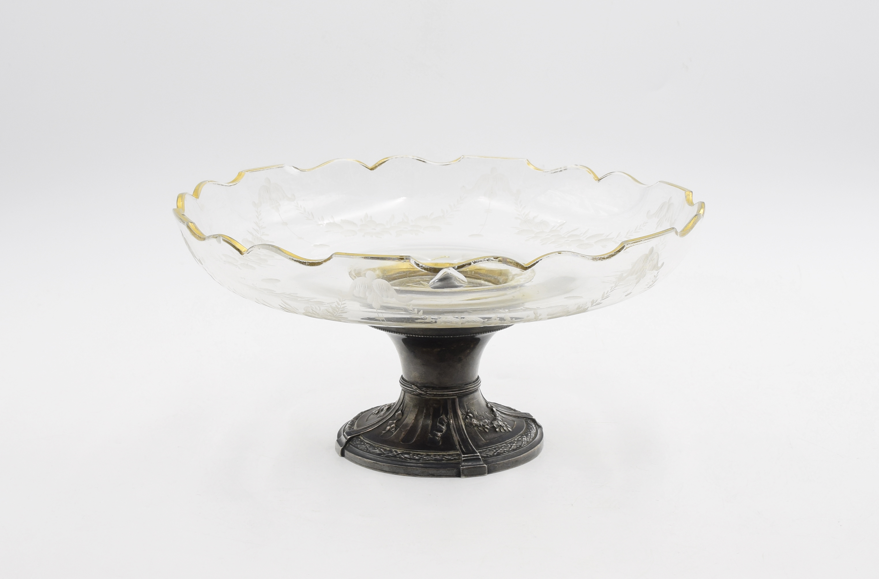 szkło bezbarwne, szlifowane, złocona na krawędzi; podstawa srebrna (dociążana); 12 x 24,5 x 24,5 cm;