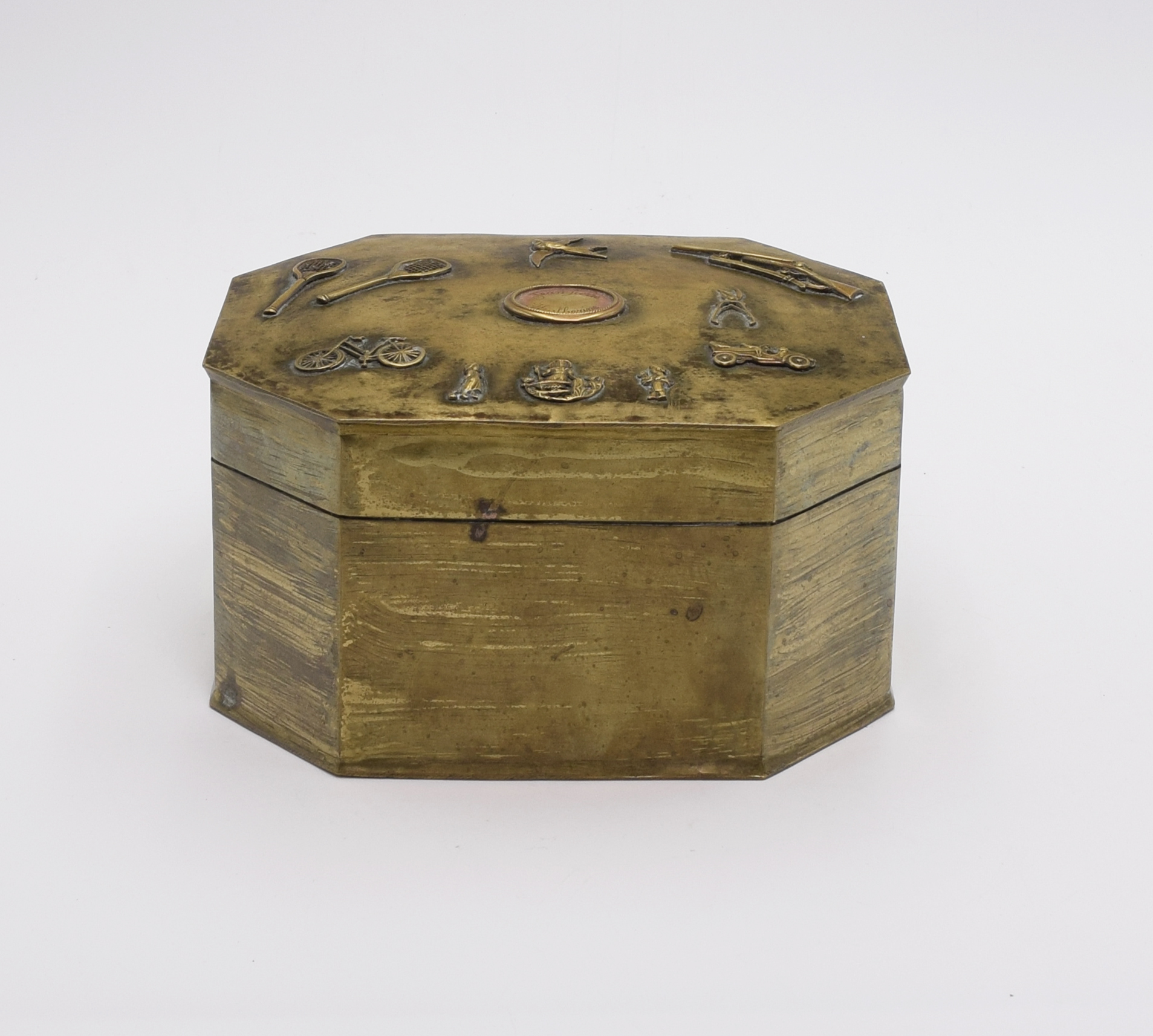 na wieczku: "Jean-Pierre / Katherine", pokrywa zdobiona motywami sportowymi, myśliwskimi, rodzajowymi.