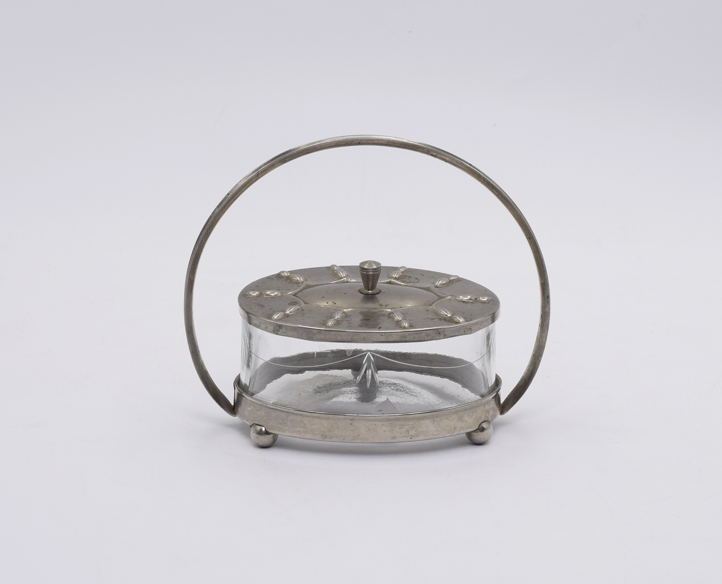 metal chromowany?, szkło przeźroczyste, szlifowane; 14 x 16,5 x 8,5 cm.