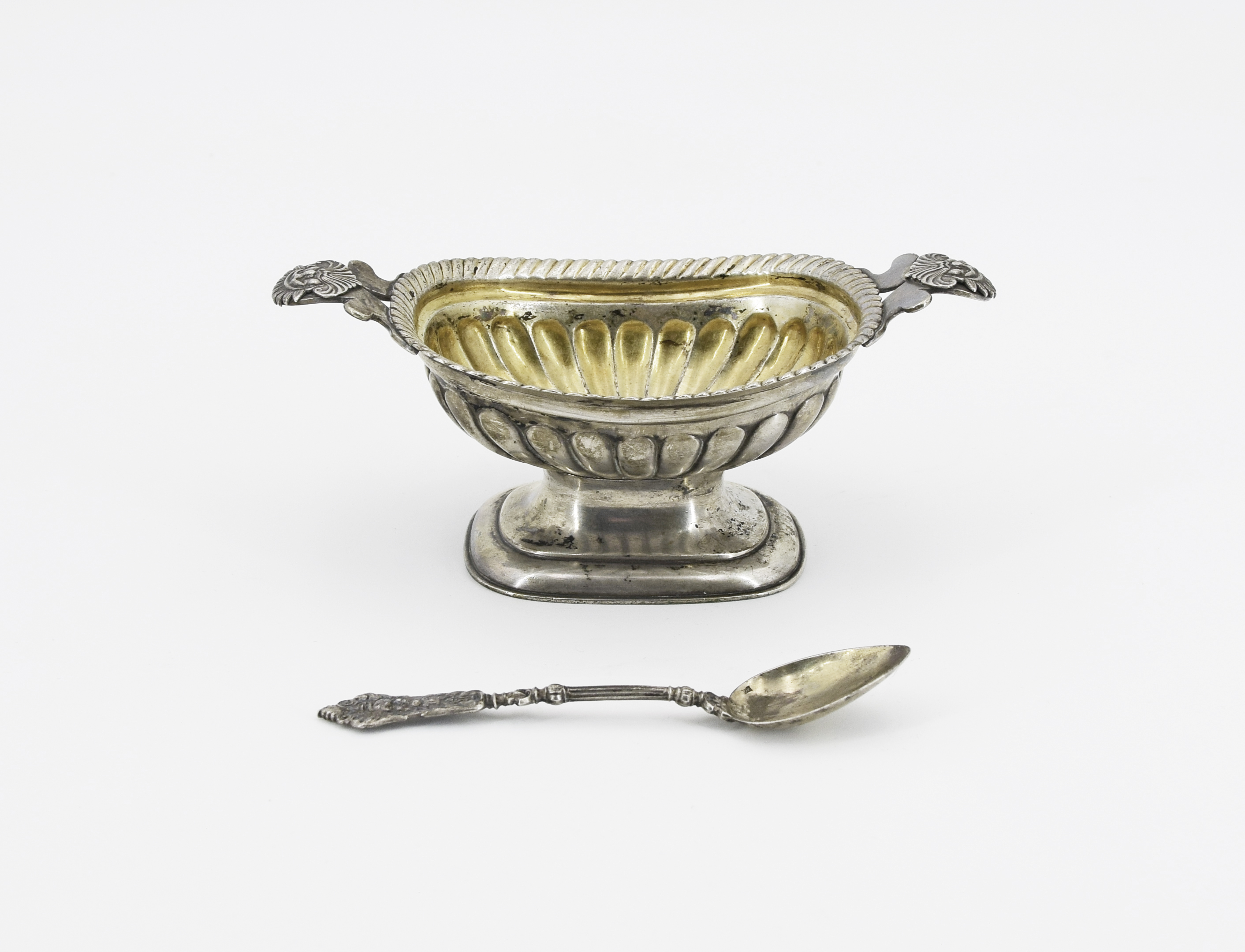 solniczka - srebro próby 12 częściowo złocone; łyżeczka - srebro próby 3;
