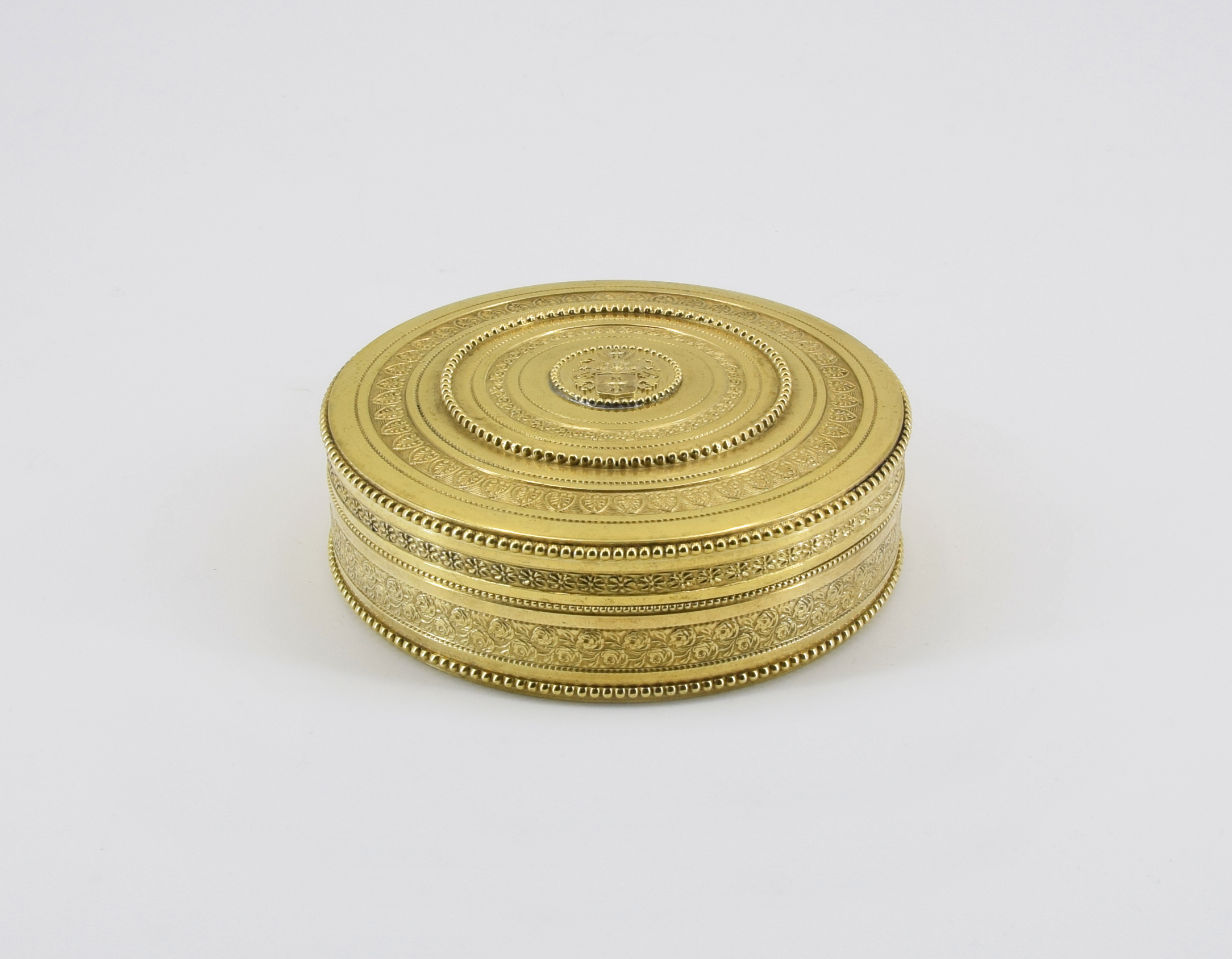 brąz złocony, śr. 10,5 cm, wys. 3,5 cm;