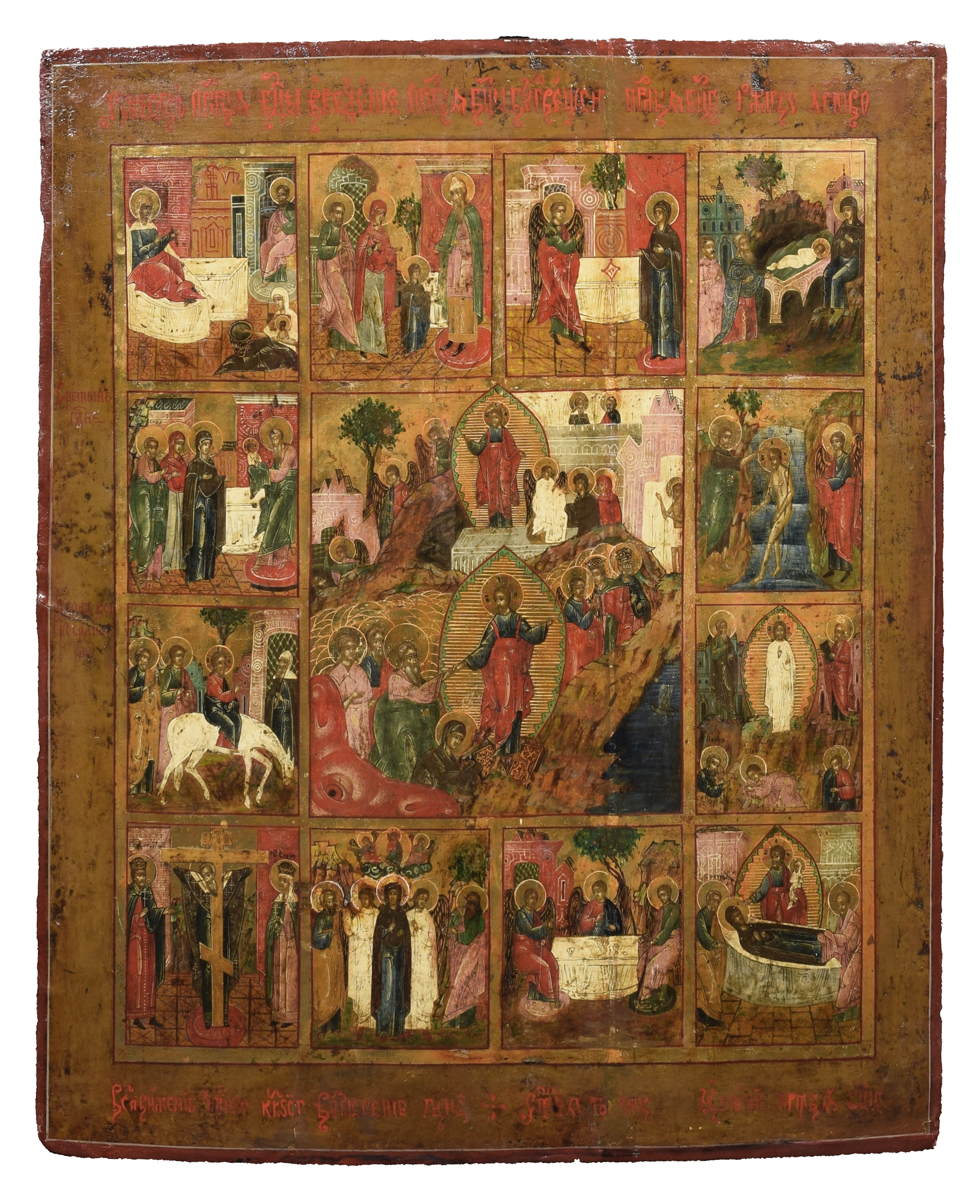 tempera, deska, podkład kredowo-gipsowy, złocenia; 71,5 x 59 x 2,5 cm; Rosja, pocz. XIX w. Scena środkowa rozbudowana z wyobrażeniem Anastasis - Zstąpienia Chrystusa do Otchłani i Zmartwychwstania Jezusa Chrystusa. Scena ta otoczona jest przez 12 kwater zewnętrznych ukazujących sceny głównych Świąt Kościoła Rosyjskiego Roku Liturgicznego: Narodzenie Jezusa Chrystusa, Ofiarowanie Jezusa Chrystusa w Świątyni, Chrzest Jezua Chrystusa, Zwiastowanie Najświętszej Marii Panny, Wprowadzenie Najświętszej Marii Panny do Świątyni, Wjazd Jezusa Chrystusa do Jerozolimy, Przemienienie na Górze Tabor, Wniebowstąpienie Jezusa Chrystusa, Zaśnięcie Najświętszej Marii Panny, Podwyższenie Krzyża Pańskiego, Święta Trójca Starego Testamentu, Narodzenie Najświętszej Marii Panny. Bordiura jednolita brązowa, w niej napisy objaśniające cyrylicą poszczególne sceny z kwater. Obramienie ujęte białą linią i czerwonym pasem.