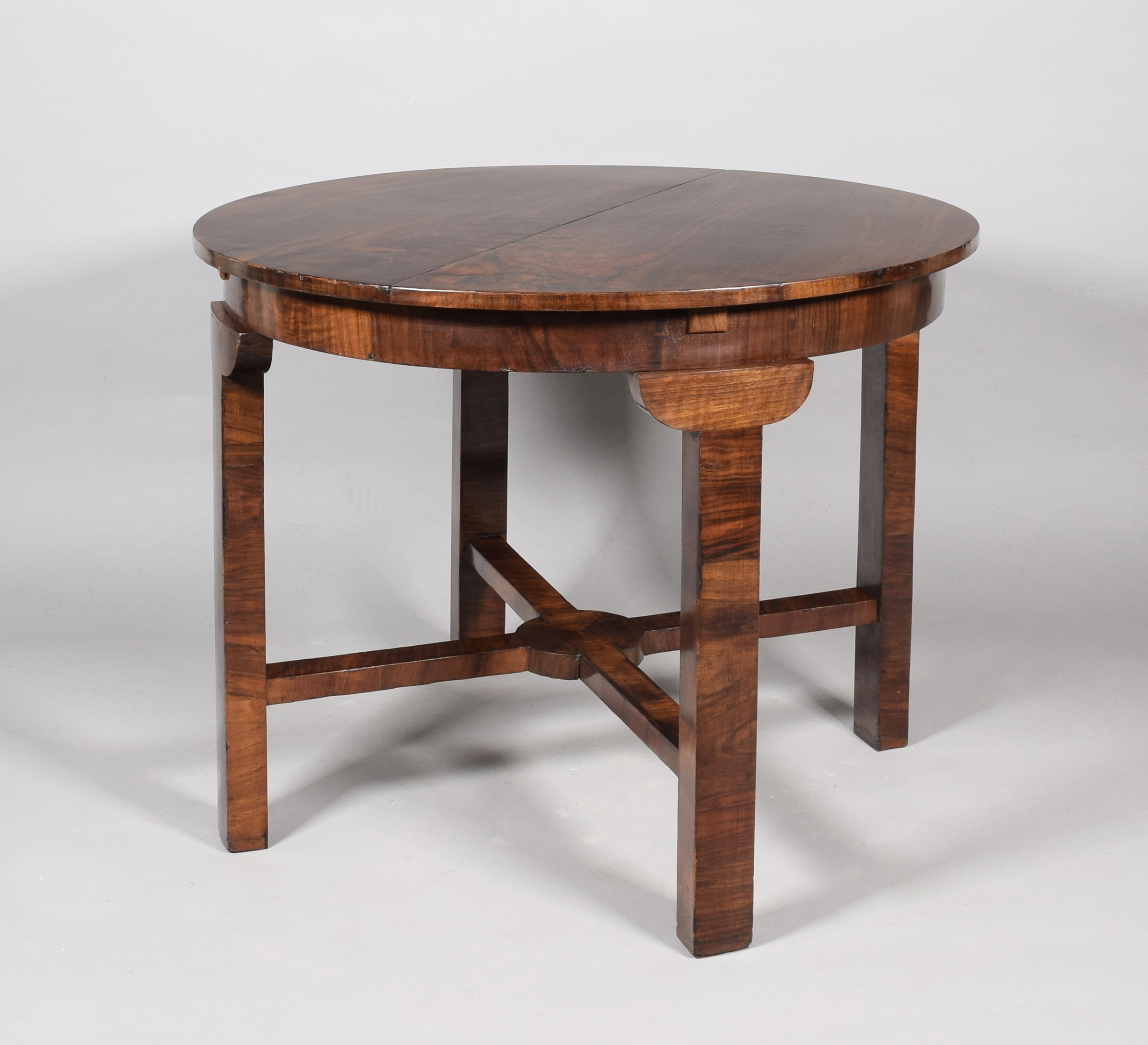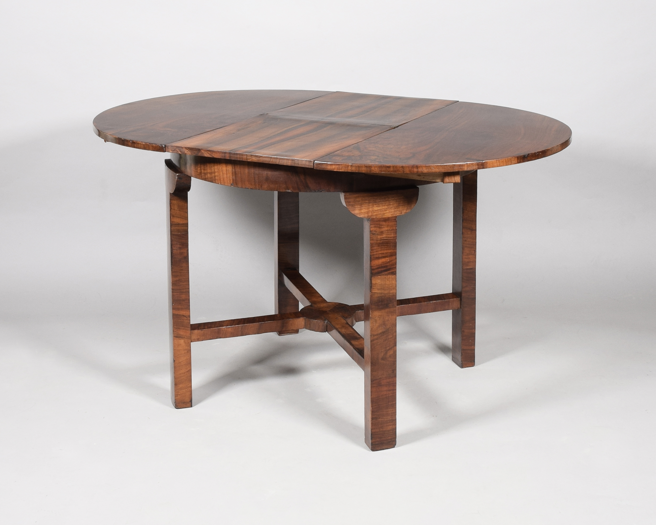 stolik rozkładany; okleina orzechowa, konstrukcja sosnowa, wys. 76 cm, średn. 90 cm;