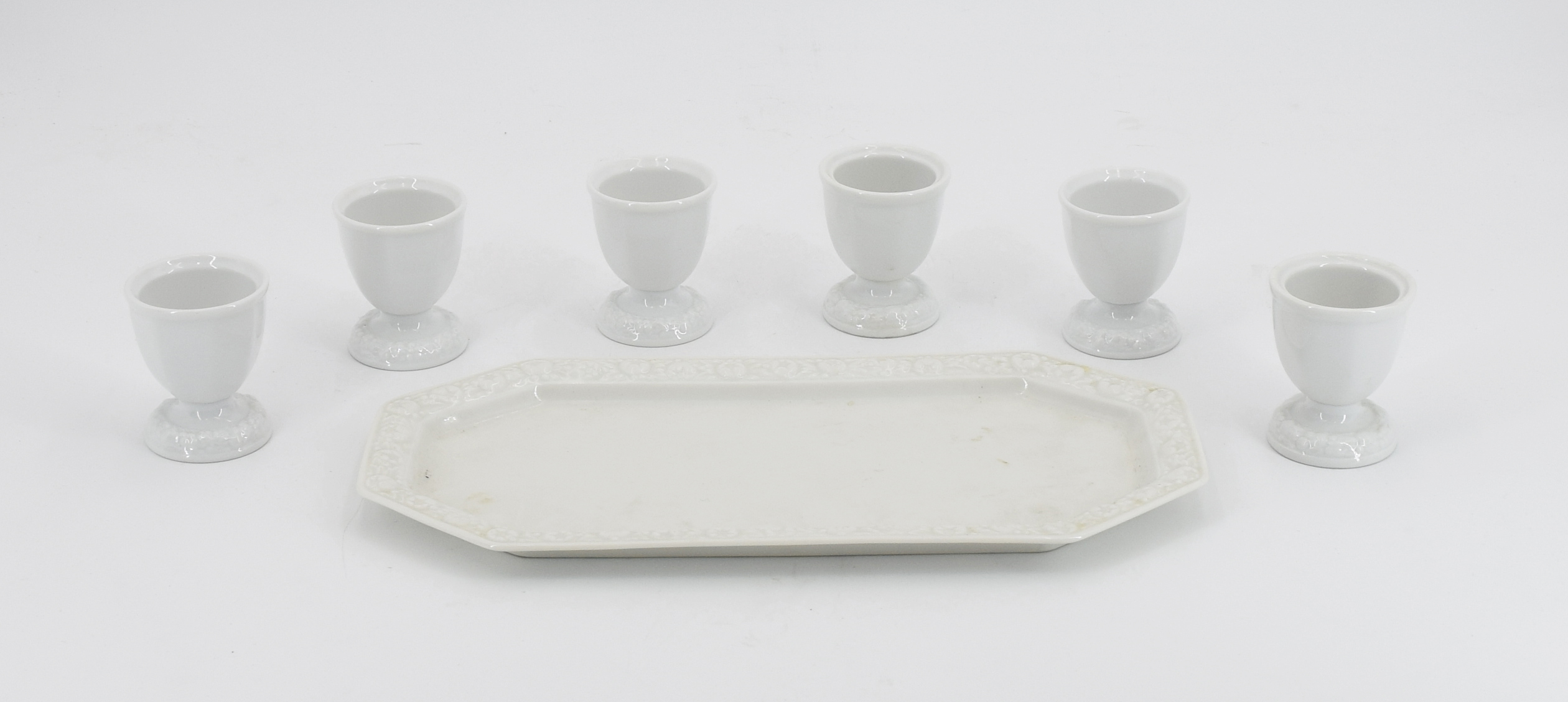 porcelana: biała, w odcieniu écru; paterka: ok. 2,5 x 28,4 x 14,2 cm, wys. kieliszków: 6 cm;