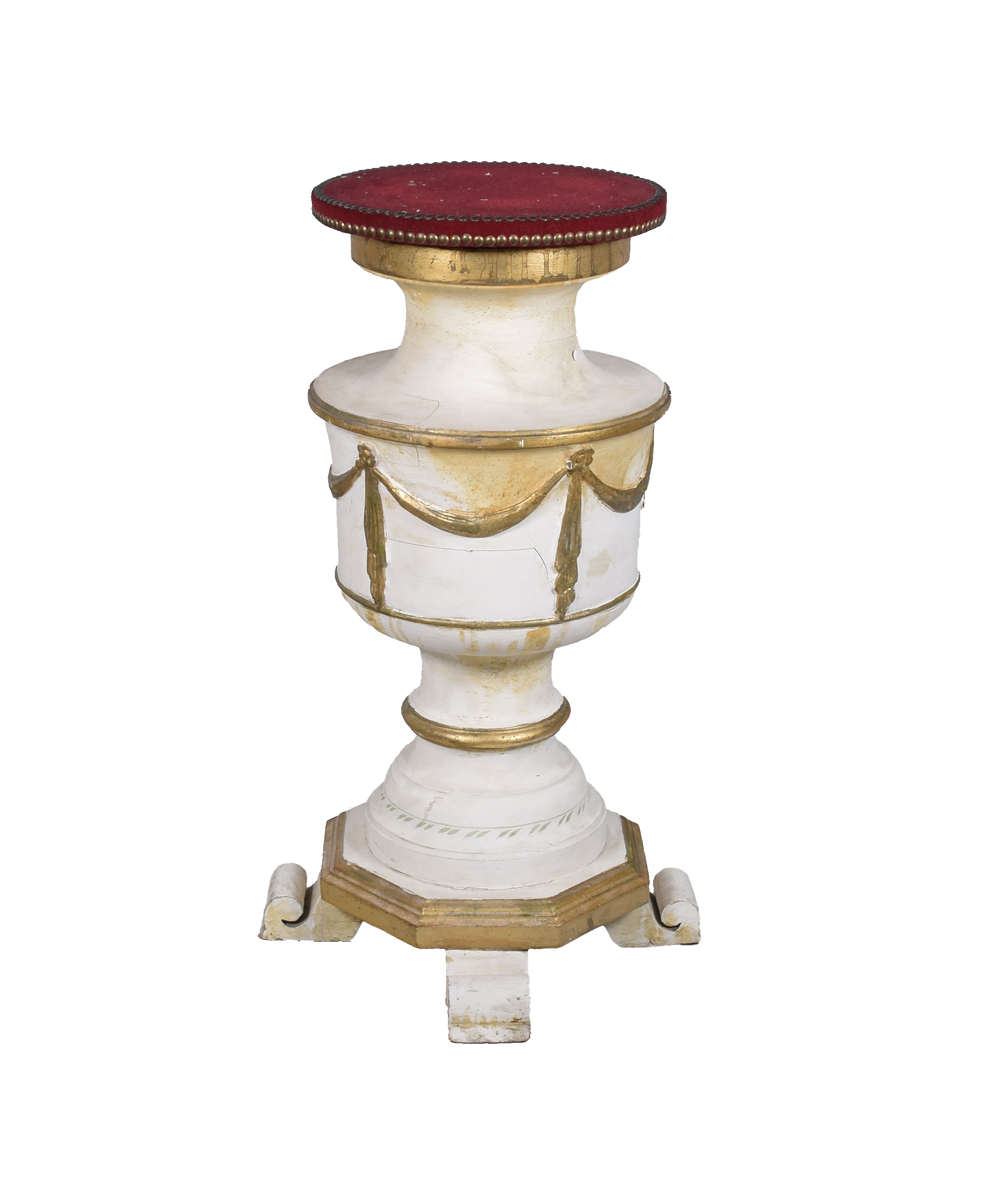 drewno, zamsz, stal, farba biała, złota; 76 x 44,5 x 44 cm.